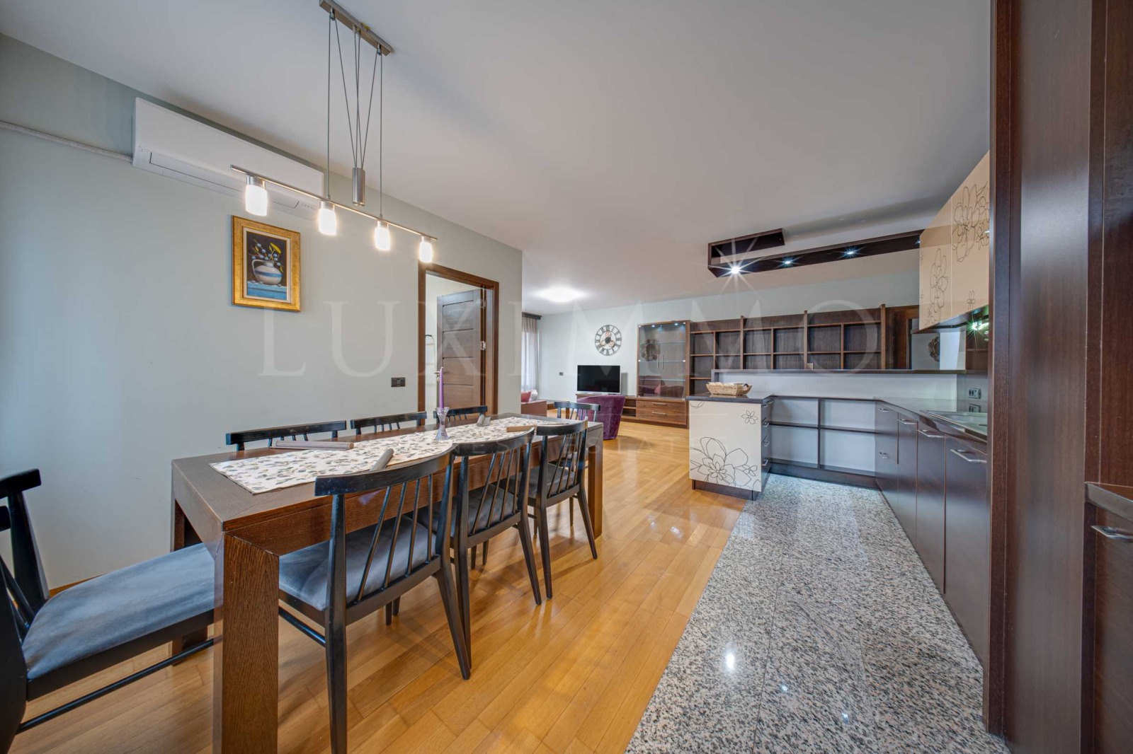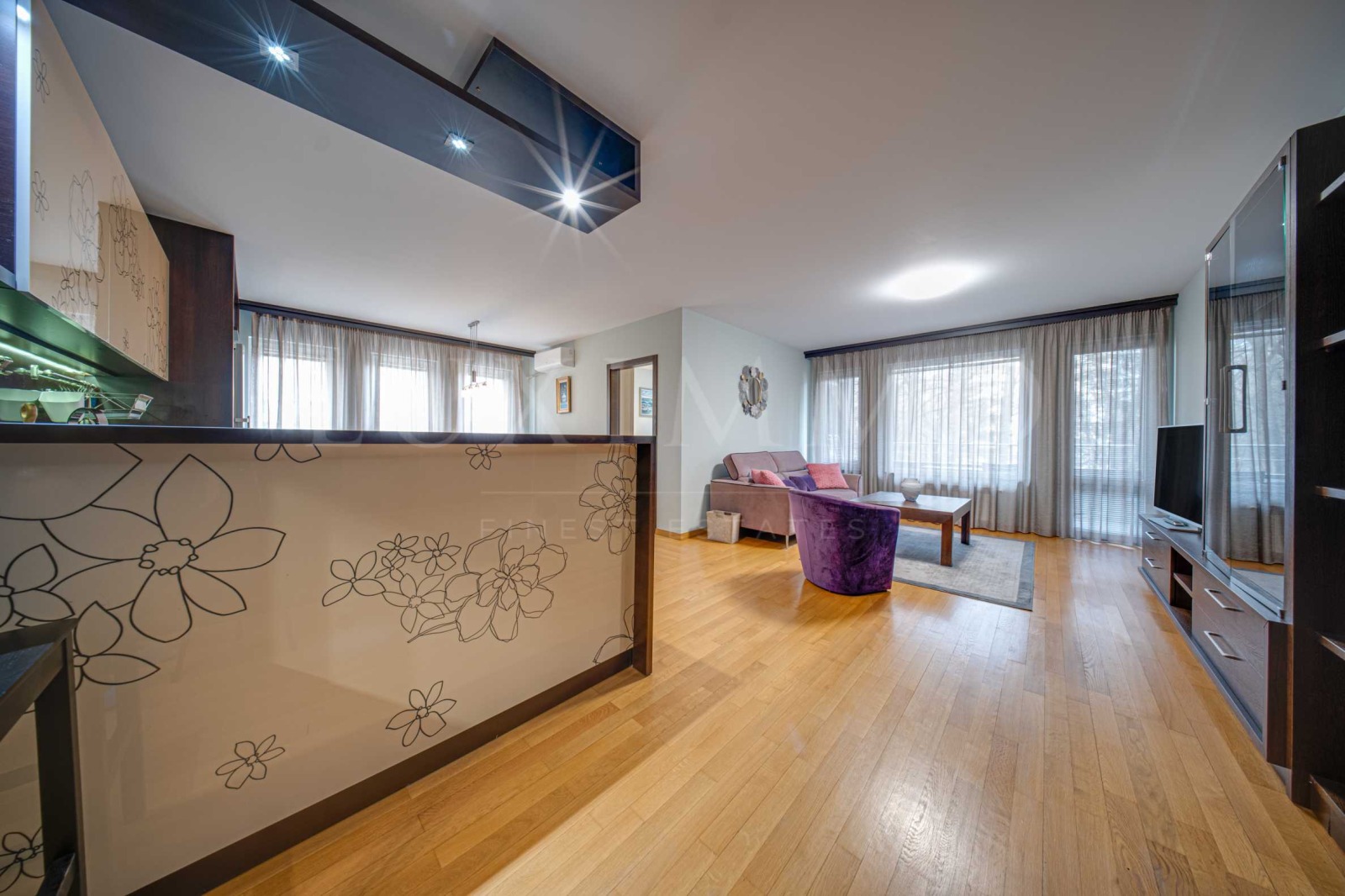 Жилището е завършено в уютен класически стил, с качествени мебели и висок клас електроуреди, с комфортна, семейна атмосфера за живеене. Апартаментът е с изложение изток запад, което осигурява естествена светлина през целия ден. Отоплението е на ТЕЦ, а в дневната е монтиран климатик за допълнителен комфорт.