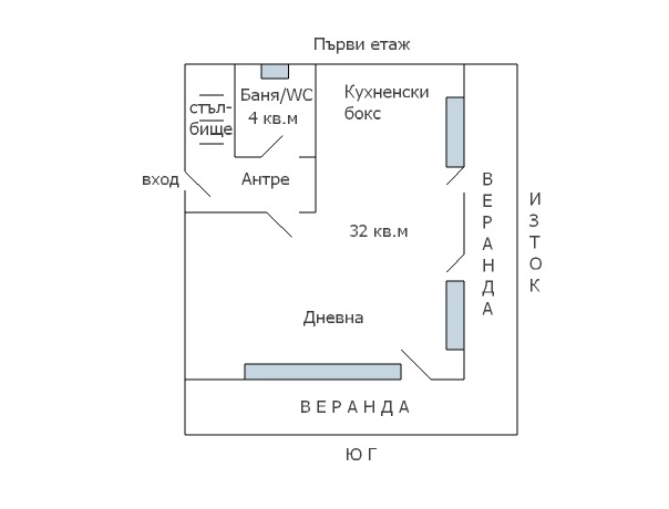 Първият етаж със застроена площ 60 кв.м се състои от входно антре, просторна дневна с кухненски бокс (32 кв.м) и излаз на веранда, баня с тоалетна. Вътрешно стълбище води до втория етаж, който включва три спални (по 13 кв.м всяка), тераса към две от тях, коридор, баня с тоалетна (4 кв.м) и перално помещение (2 кв.м). Изложението е юг/изток. Открива се красива морска панорама.