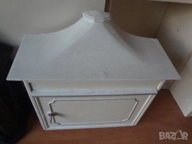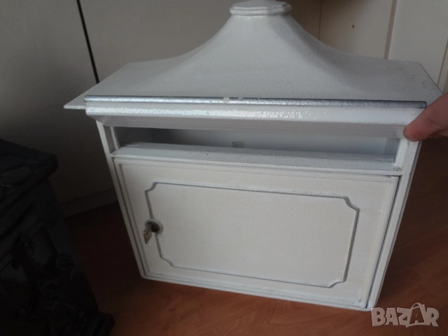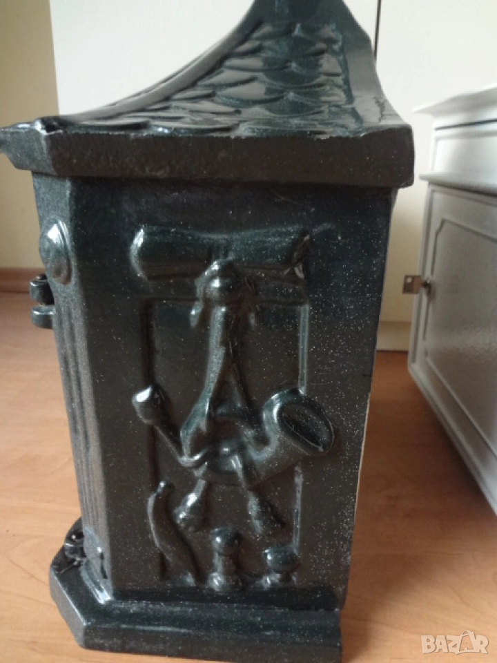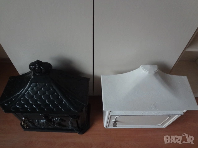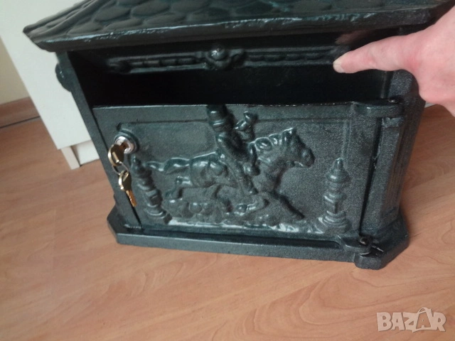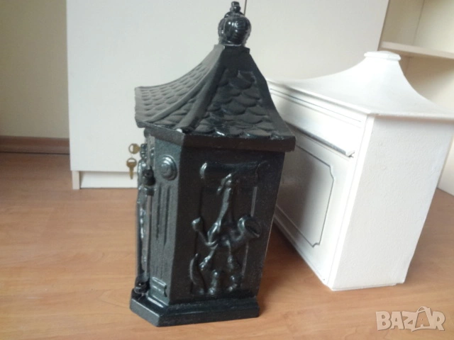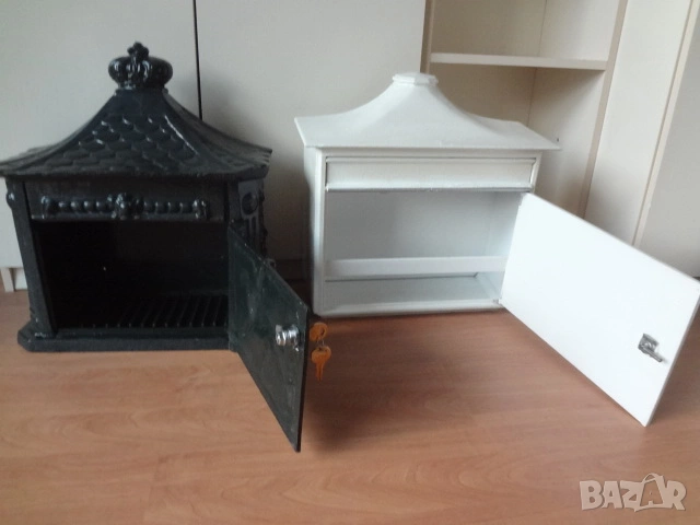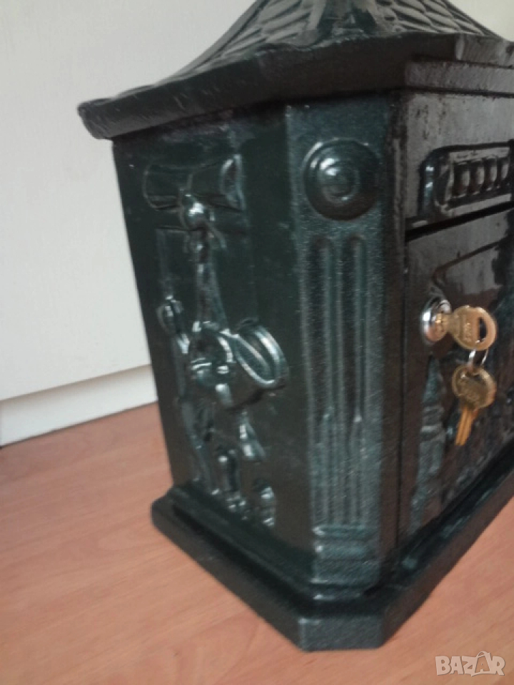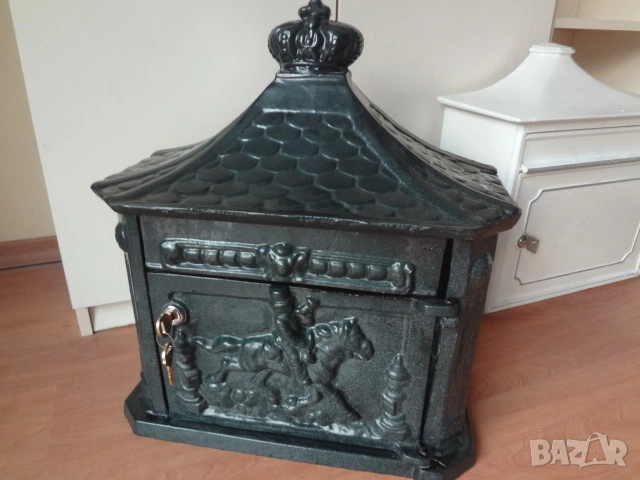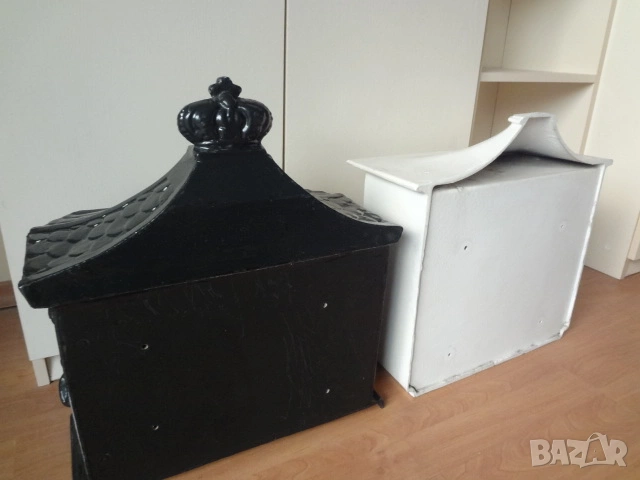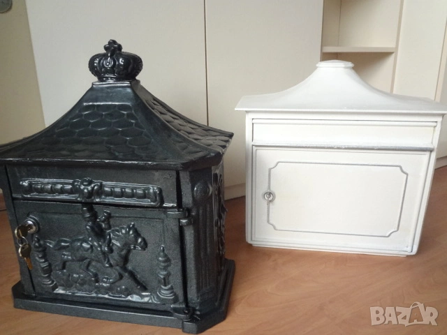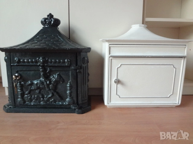 Доста големи пощенски кутии - 2 бр. от Германия. И двете са масивни и са изработени от лят алуминий с дебели стени от половин сантиметър и поради това никога няма да ръждясат и на практика са вечни. Тъмната е една изключително красива и уникална пощенска кутия в класически аристократичен стил, която ще ви отличи и ще направи впечатление на всеки. Кутията има изискан дизайн с красиви силно релефни и орнаментални фигури представляващи конник (традиционен пощальон) и други пощенски символи. Такава кутия ще придаде изискан вид на всяка фасада или ограда и класа на всеки дом. Понеже е изработена от дебел лят алуминий е изключително здрава, но същевременно лека и е напълно устойчива на ръжда (за разлика от обикновените железни кутии). Разполага със секретна ключалка с 2 бр. оригинални ключа (виждат се на снимката), за да е добре защитена вашата кореспонденция. Има интересен декоративен покрив с „керемиден“ ефект завършващ с корона. Подходяща е за писма, списания и малки пратки. Перфектна е за собственици на къщи, които държат на детайлите, или като оригинален подарък за нов дом. Кутията е отлично запазена, без дефекти и готова за монтаж. Идеална е както за къщи и вили, така и за офиси или бизнес имот.