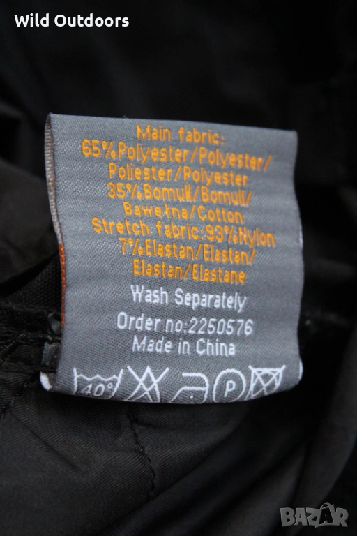 65% полиестер и 35% памук - здрава материя в комбинация със (сивата) зони от полиамид и еластан за комфорт при движение, приклякане и т.н.