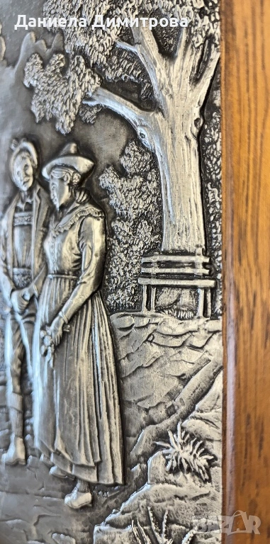 Релефна картина от калай в рамка от дърво масив, изобразяваща романтична разходка сред природата.