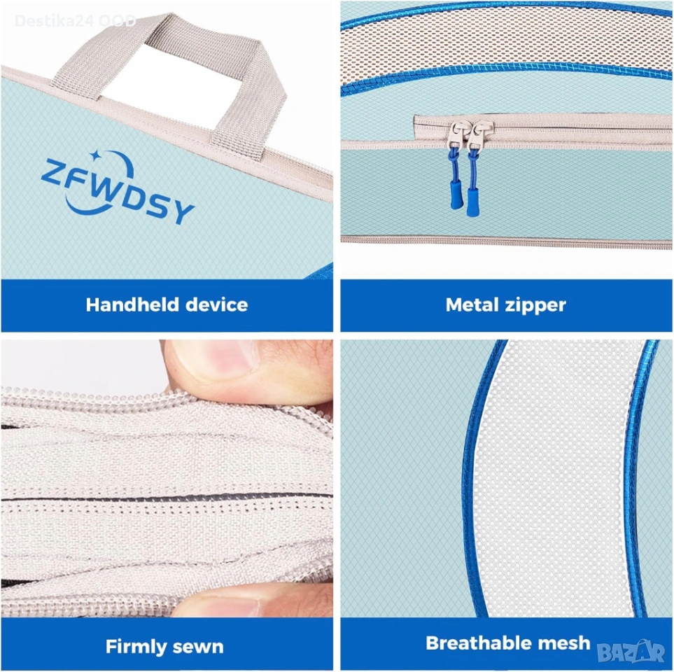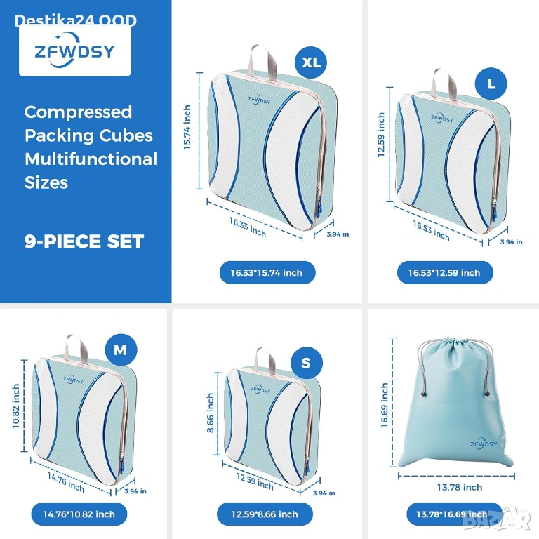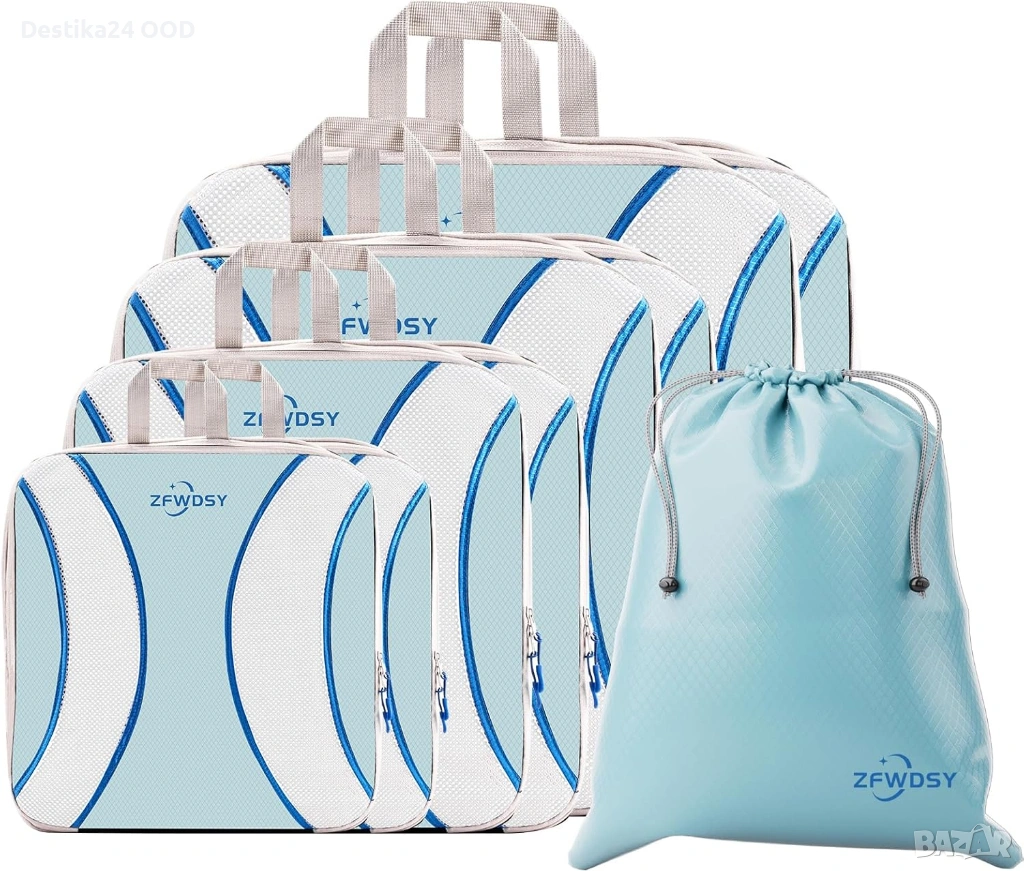 Практичен комплект органайзери за куфар – 9 части, който ще ви помогне да подредите багажа си лесно и удобно при пътуване. Благодарение на компресиращата система с двойни ципове, органайзерите намаляват обема на дрехите и могат да спестят до 60% място в куфара.