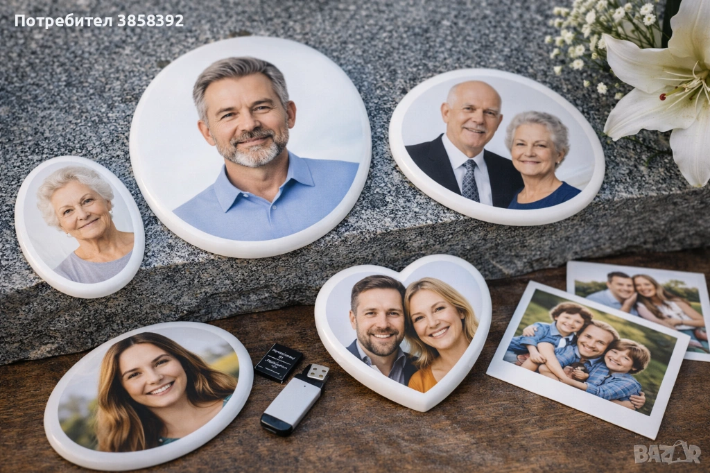Във Fotomara изработваме порцеланови и керамични снимки за паметници, които запазват образа на вашия близък десетилетия наред. Снимките са устойчиви на дъжд, слънце, студ и атмосферни условия, благодарение на специална технология за мемориален печат върху порцелан.