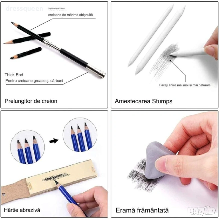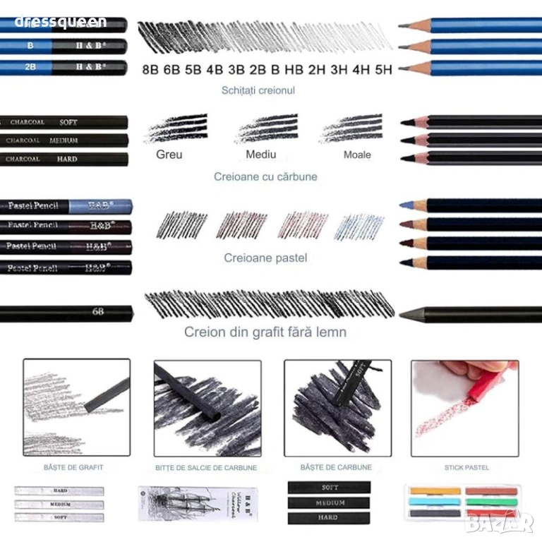 Моливи и Стикери: 12 графитни молива, 3 въглени молива и 15 стика (графит въглен пастел върба).