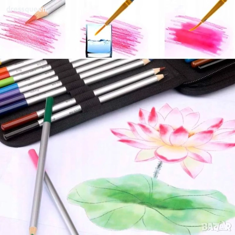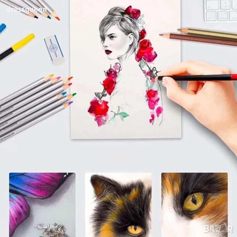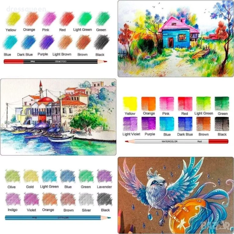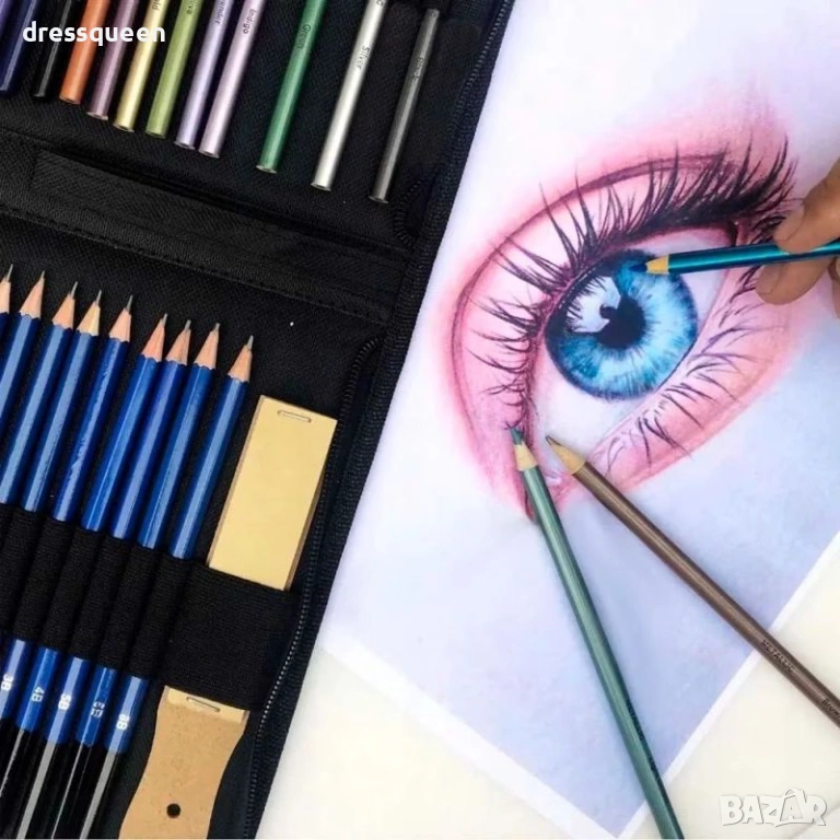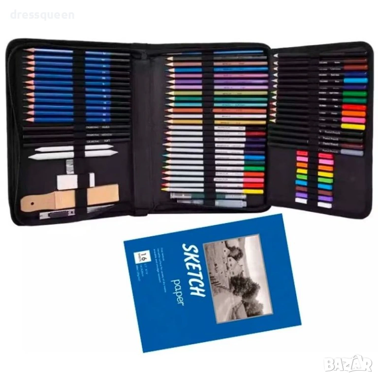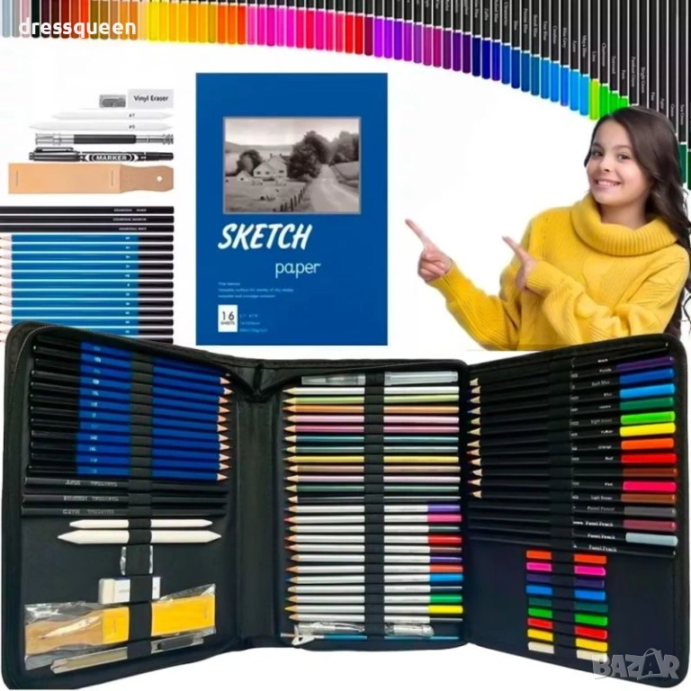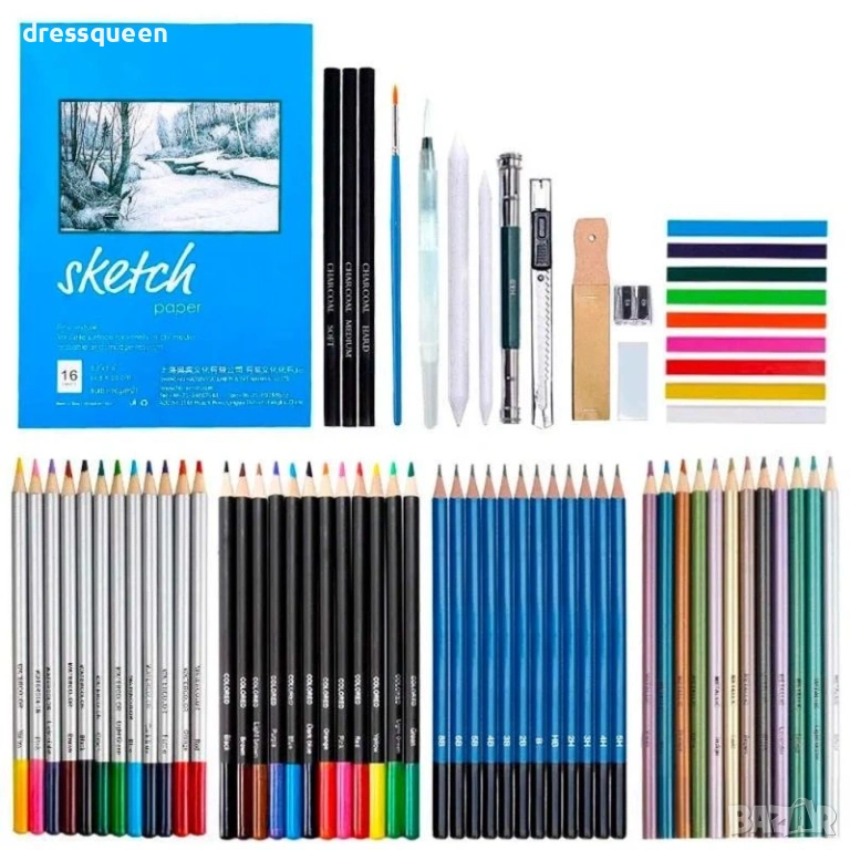 Моливи: Общо 60 броя моливи (графитни цветни акварелни металик и въглени).