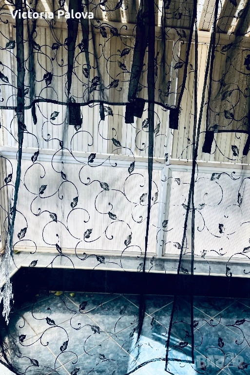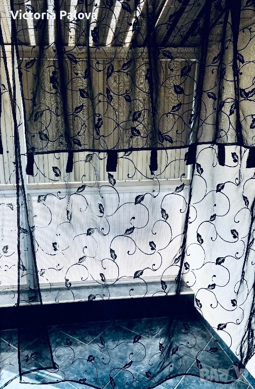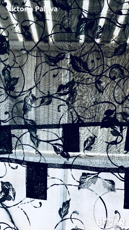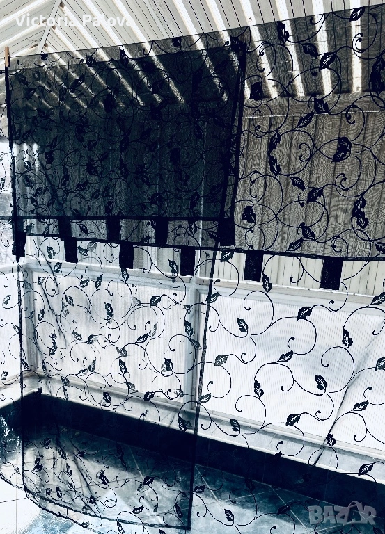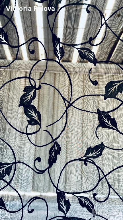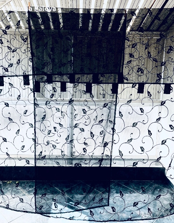 Комплект от два броя ефирни черни пердета с изискан флорален десен от преплитащи се клонки и листа, които придават на интериора модерен и същевременно артистичен облик. Всеки панел е с размери 230 см височина и 140 см ширина, като са изработени от качествена и устойчива материя със състав 50% полиамид и 50% полиестер, което ги прави изключително здрави, лесни за поддръжка и бързосъхнещи. Макар че не са нови, пердетата са в отлично състояние, със запазени наситени цветове и здрава тъкан, готови веднага да внесат нов уют в хола, спалнята или на вашата тераса. Моделът е предвиден за лесно и бързо директно нанизване на тръбен корниз, което създава красиви естествени гънки и придава завършен вид на помещението. Тези пердета осигуряват дискретност, без да спират притока на естествена светлина, и са практичен избор за всеки дом.