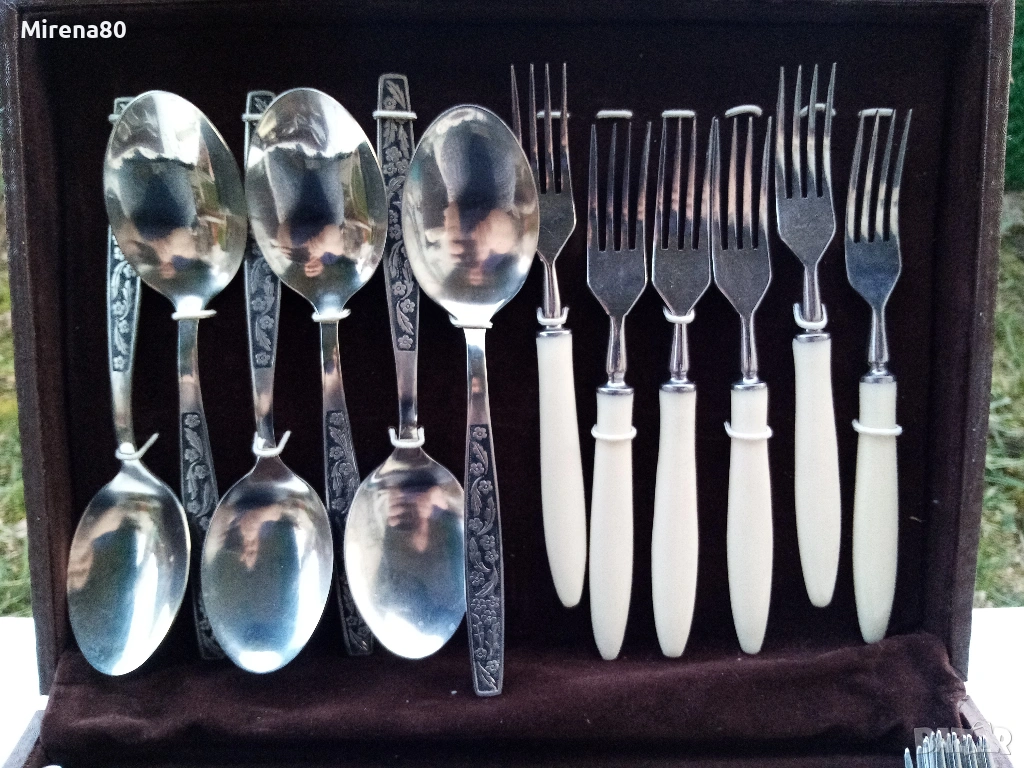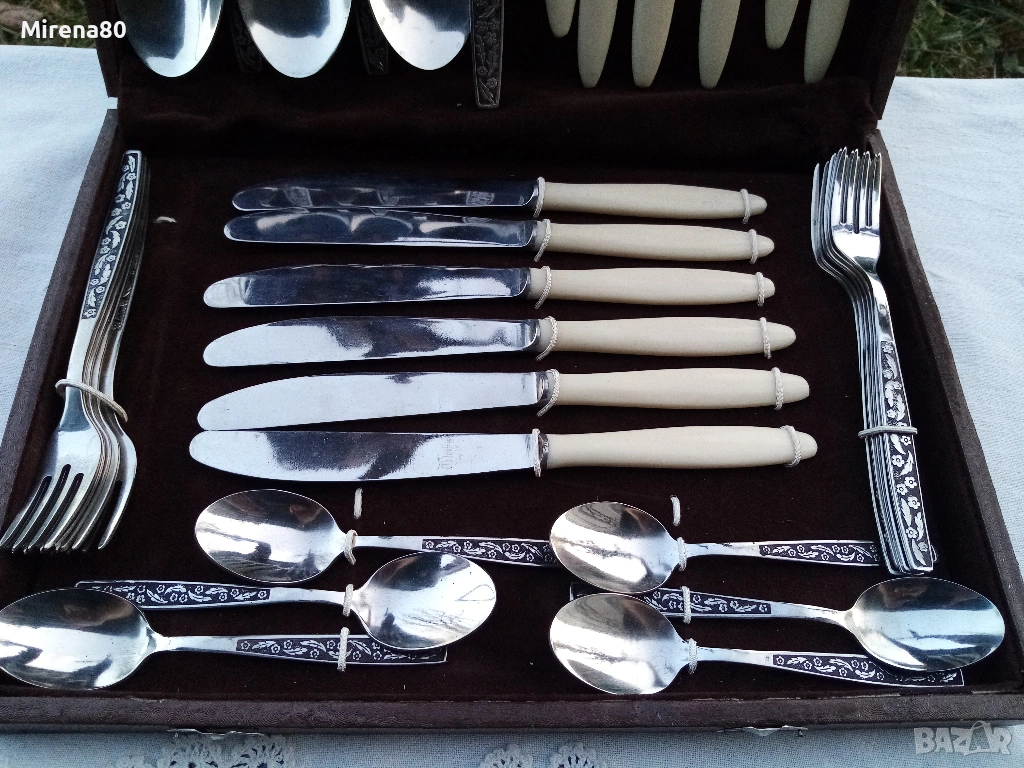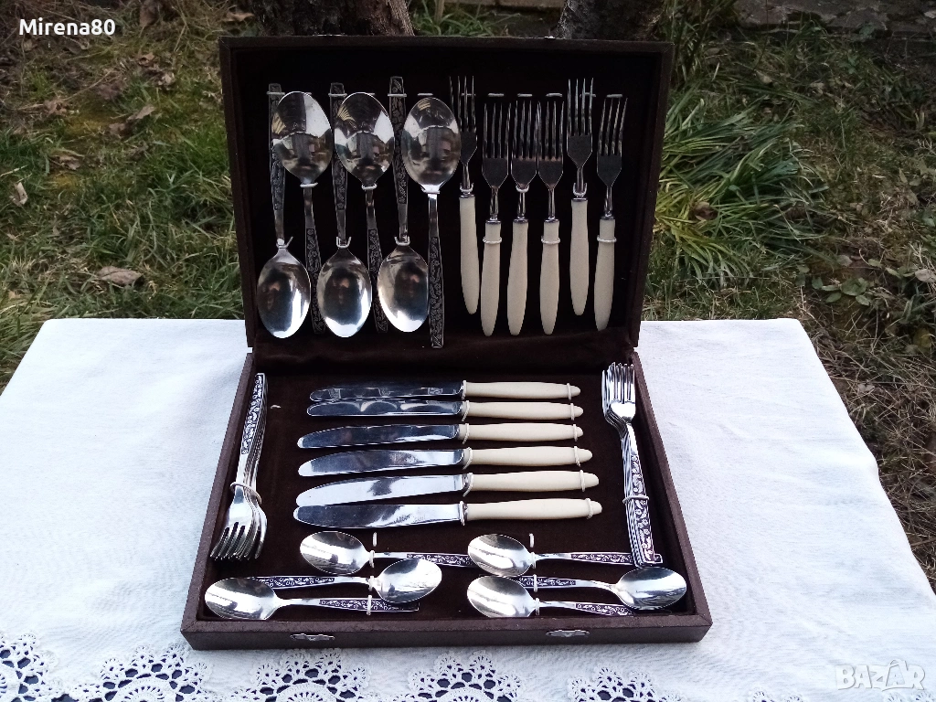 стомана, Дръжките на ножовете и вилиците имитират слонова кост. Приборите са в оригинална дървена кутия върху легло от шоколадовокафяво кадифе. Безупречни !