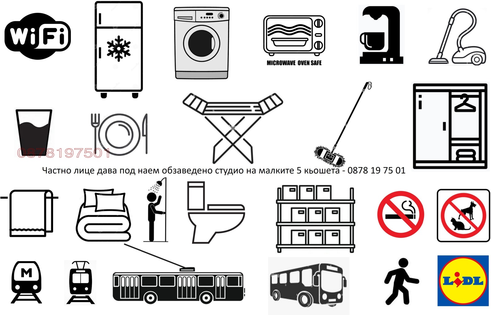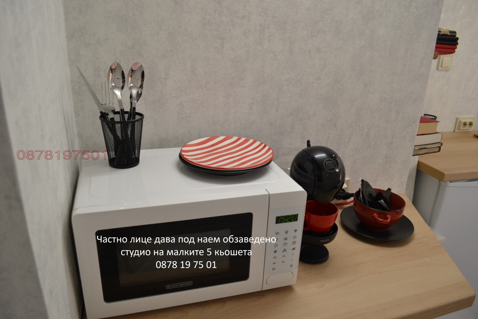 Студиото е след основен ремонт, напълно обзаведено и оборудвано - хладилник, пералня, микровълнова, кафе машина за капсули, плотове, столове, легло с чекмеджета под него, гардероб, етажерки, закачалка, рафтове, щори, комарник, прахосмукачка, посуда, метална входна врата, икономично LED осветление, оптичен интернет и WiFi.