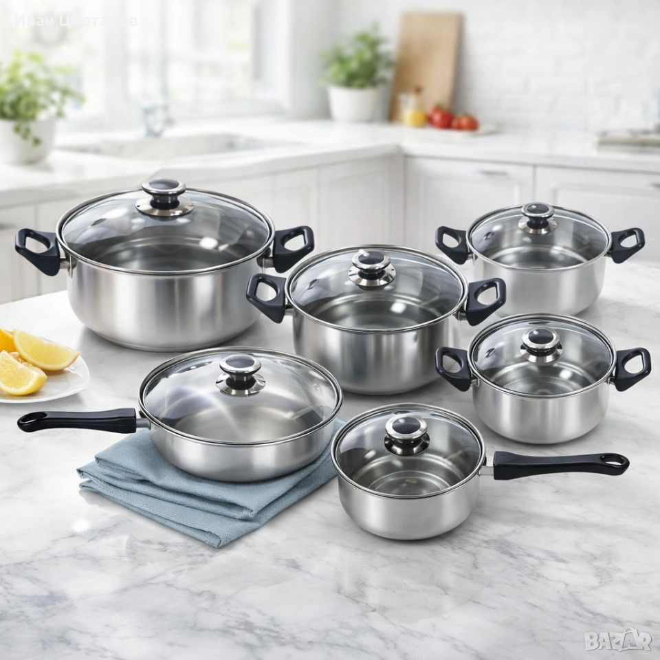 Комплект готварски съдове от инокс 12 части: 5 тенджери, тиган и стъклени капаци (16-24 см)
