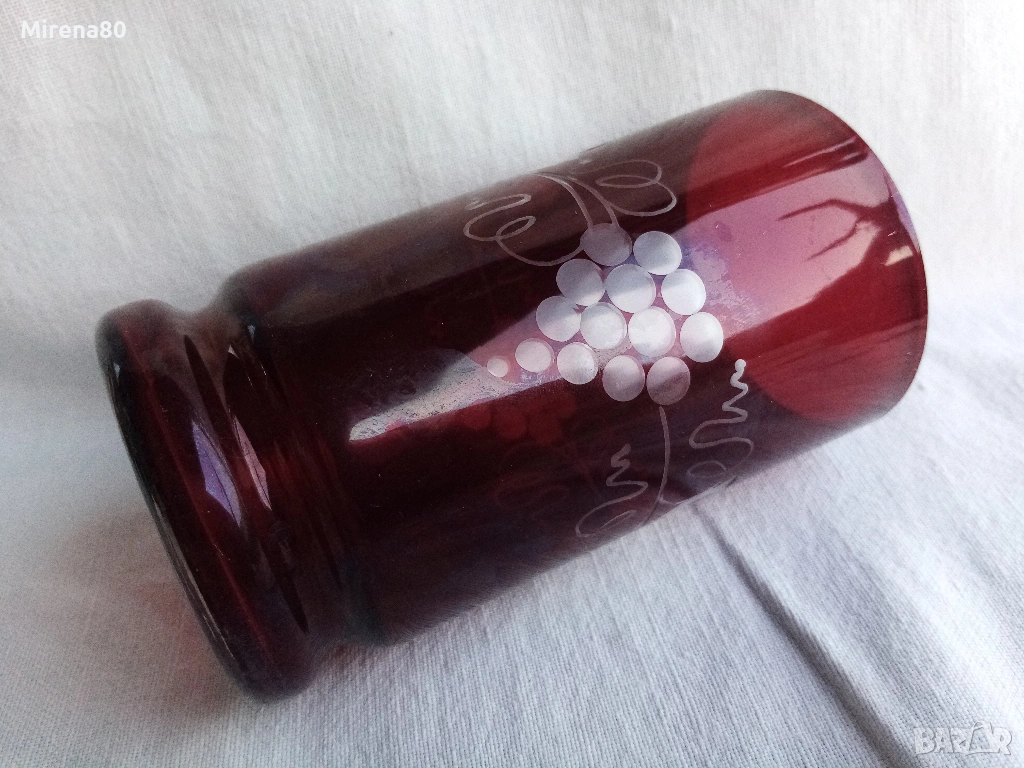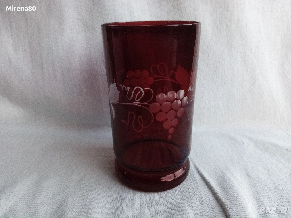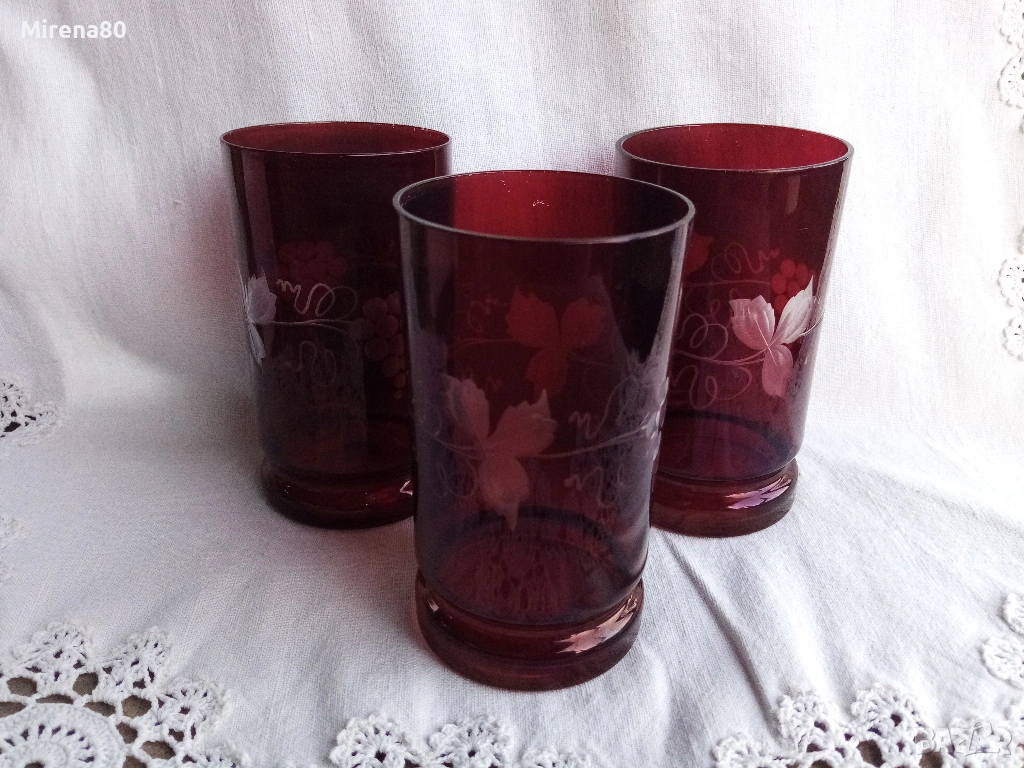3 чаши за вода или безалкохолно на достолепна възраст. Бохемско стъкло от Чехословакия в цвят "рубинено червено" с декор грозде - много красиви на живо. Без пукнатини или нащърбявания, единствено миниатюрни "точици" тук там по червения цвят - гледано на силна светлина и отблизо. Вмест. 300 мл, вис. 12, диам. 6.5 см.