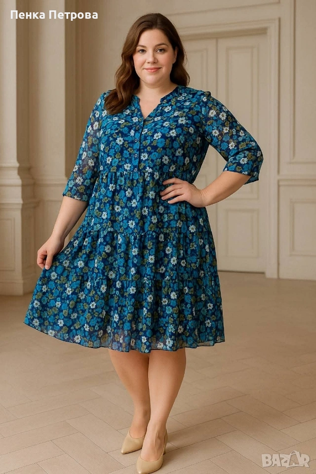 ✅Свежи рокли в тъмно синьо с флорален принт, с пищна харбала и копченца на деколтето, с два странични джоба, 3/4 ръкавчета, разкроени в ханша. Висококачествена тежко падаща материя копринен кенар: