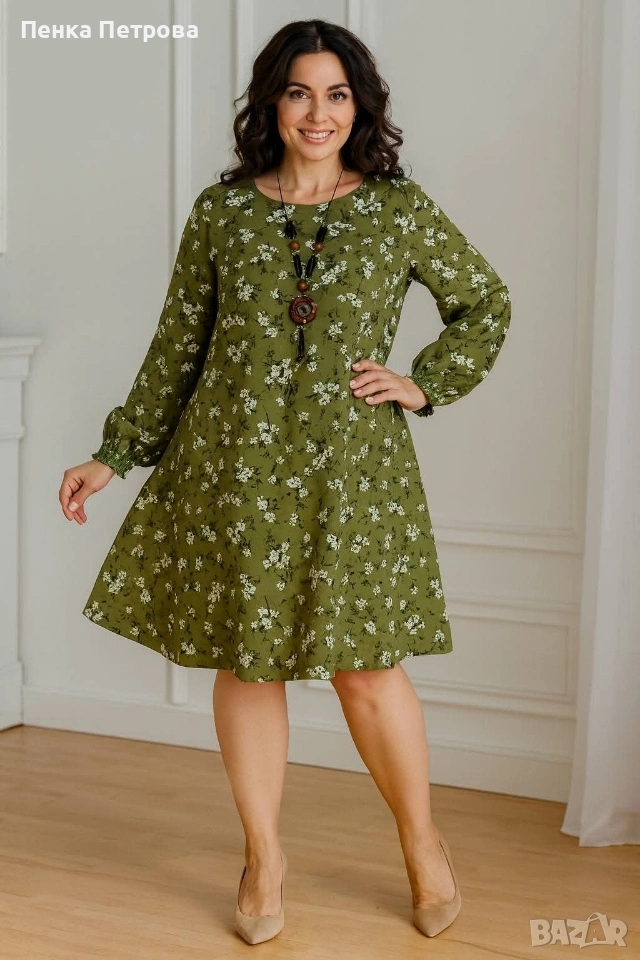 ✅ Елегантни рокли в свеж тютюнево зелен цвят с нежни бели цветенца, с дълги ръкавчета, силно разкроени в ханша, прикриват всички несъвършенства. Качествена материя коприна, НЕ СЕ мачкат: