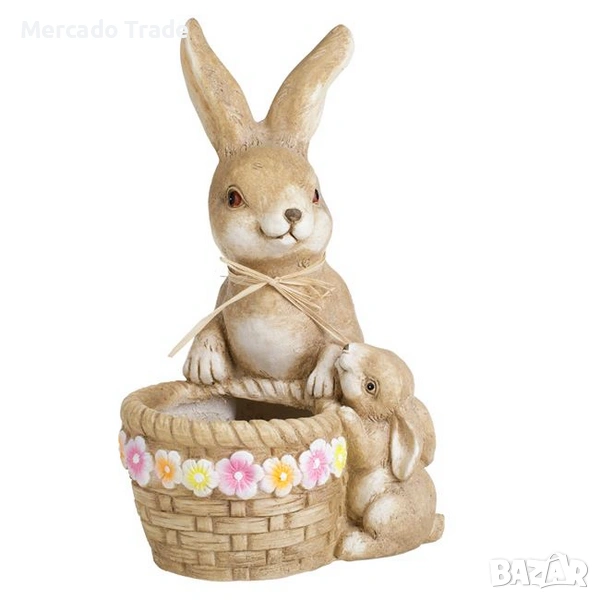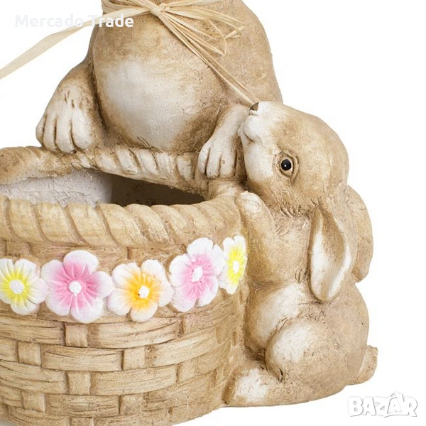 Великденско декоративно изделие, което изобразява нежна сцена с две зайчета, в традиционна кошница. Изработено от висококачествен керамичен материал, то се отличава с релефна текстура, наподобяваща естествено дърво и плетена слама. Голямото зайче е украсено с елегантна сламена панделка около врата, а основата на кошницата е обградена от редица многоцветни цветя в розови и жълти нюанси.