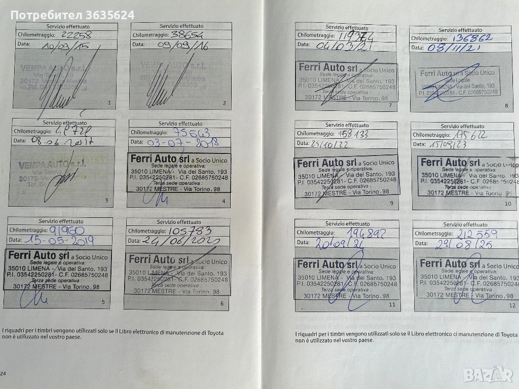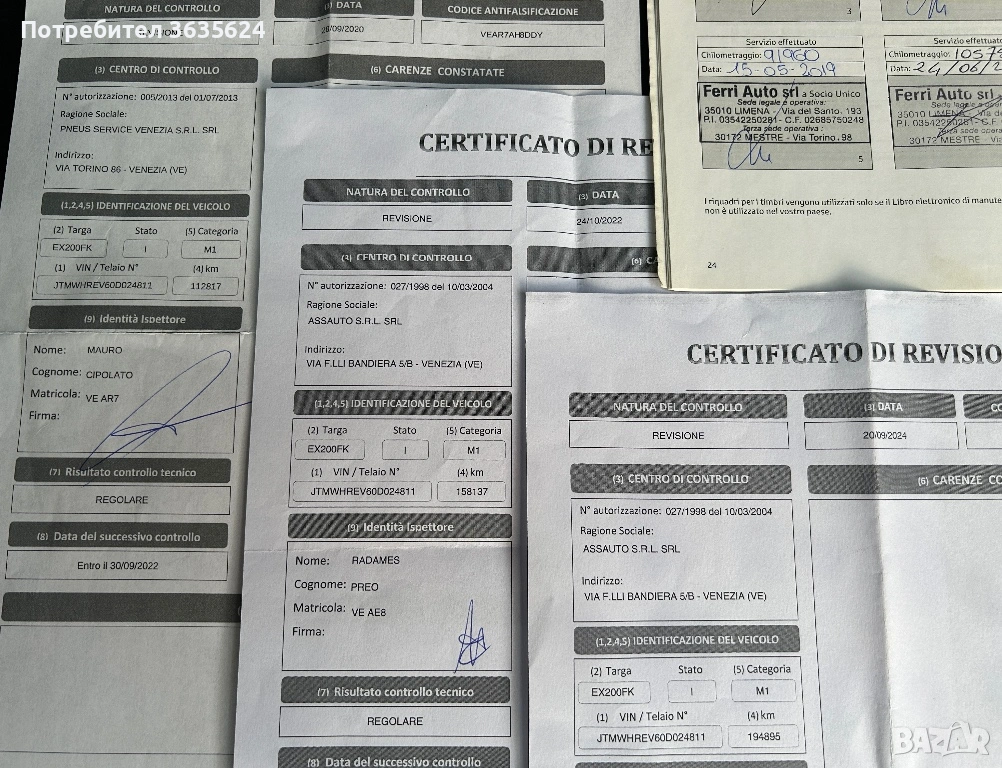 Прилагам снимка на сервизната книжка - последно обслужване на 29. 08. 2025г. и справка за техническите прегледи от последните 8 години в Италия - последният е на 20. 09. 2024г. на 194 895 км.