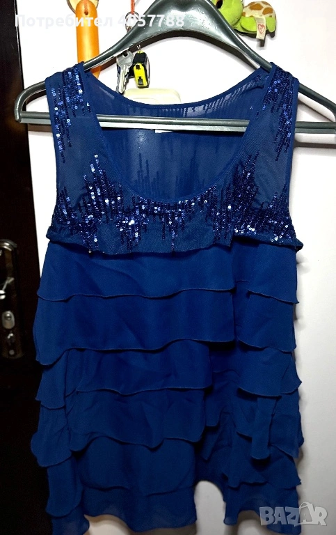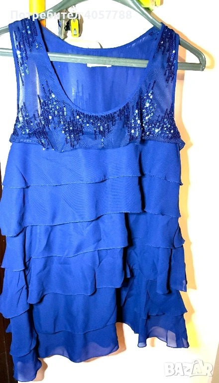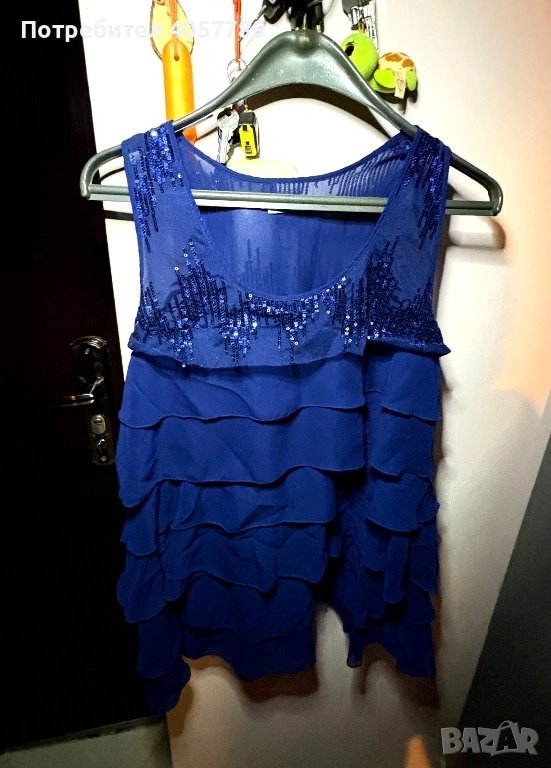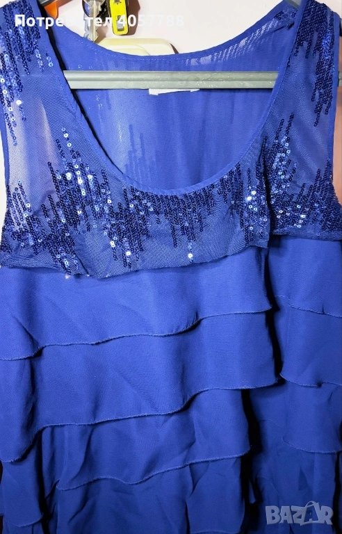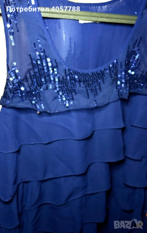 Продавам изключително ефектна официална рокля в наситено кралско синьо. Моделът е с ефирни волани и акцент от пайети в горната част, което я прави идеален избор за специални поводи. Дрехата е обличана броени пъти и е в перфектно състояние (10/10) – без забележки, петна или разтегнати нишки.