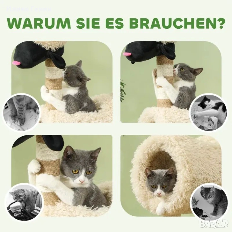 Функции за игра: Дървото за котки предлага драскалки, тунел и топка за игра, за да поддържа котката ви активна, като същевременно насърчава естествените ѝ ловни инстинкти и подпомага грижата за ноктите.