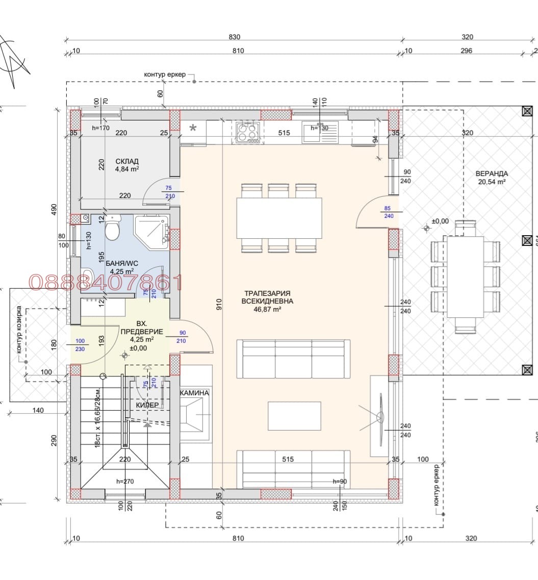 1 - ви етаж: входно антре, коридор, баня с тоалетна, складово помещение, вътрешно стълбище към втория етаж, просторна дневна 46,7м2 с френски прозорци и веранда от 20,54 м2 покрита с покрив.