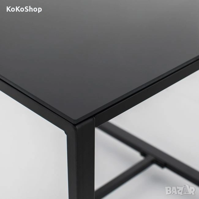 Квадратна маса с плот от черно темперирано стъкло, стабилна и практична.