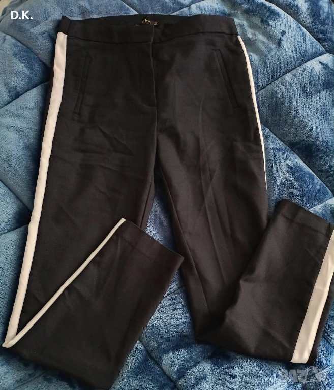 Дамски тъмносин панталон Zara. Като нов. Размер М. Талия-76см(38см едностранно),разтяга се до 90см(45см едностранно). Ханш-94см(47см едностранно),разтяга се до 108см.(56см едностранно). Цена -5€.