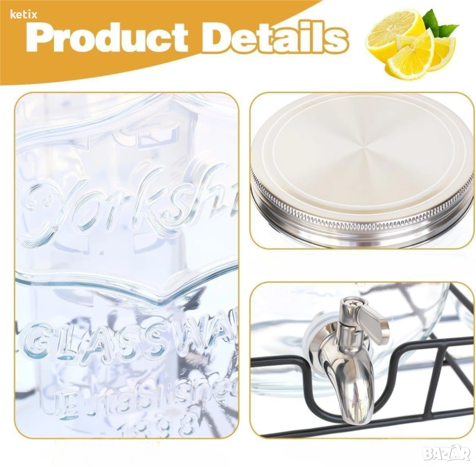 Универсален диспенсър за вода: стъкленият диспенсър за напитки е подходящ за съхранение на различни студени напитки като мляко, лимонада, сок, кафе, сангрия и др. на партита, барове и ресторанти, може дори да се използва като диспенсър за течен перилен препарат за перални помещения.