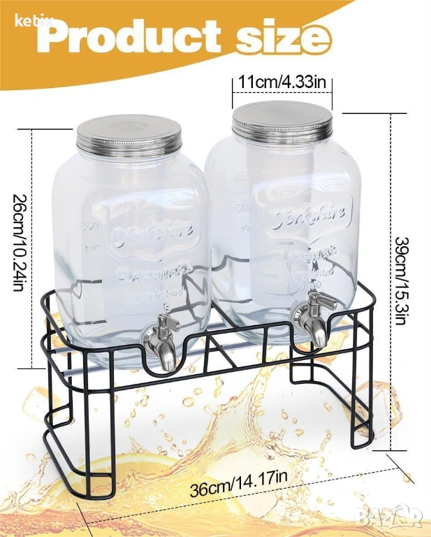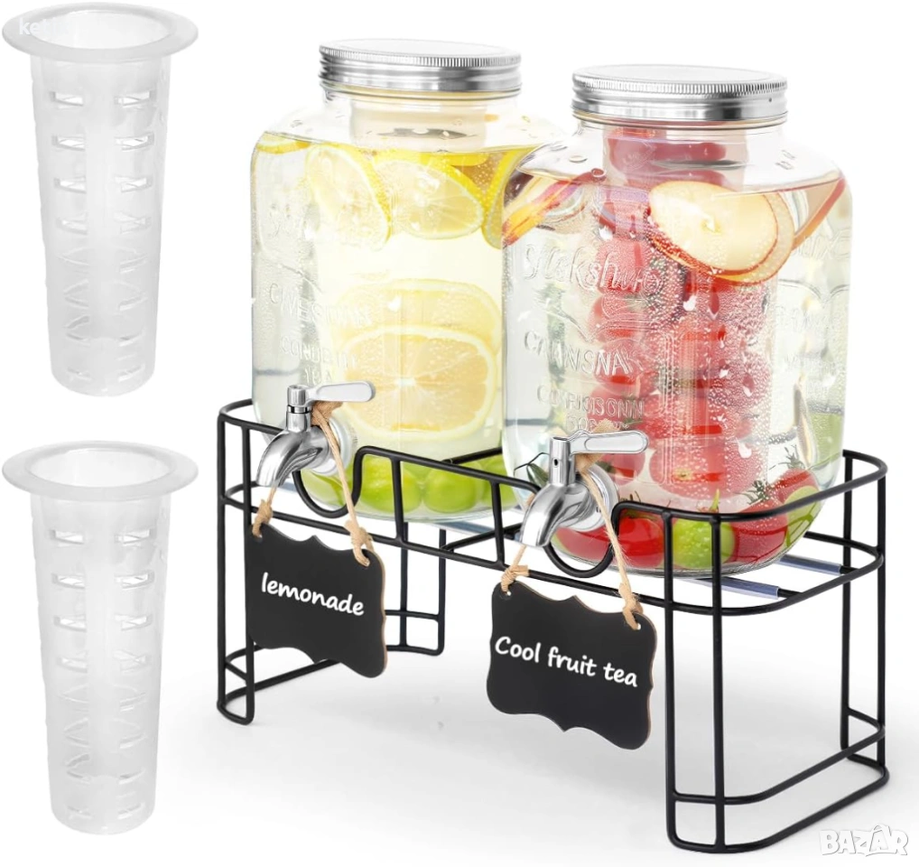 Комплектът включва: 2 диспенсъра за напитки, 2 крана, 2 инфузера за плодове, метална стойка.
