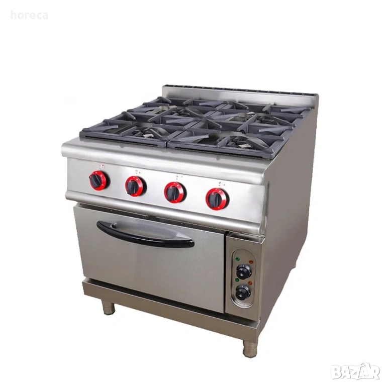 Професионална газова печка с 4 котлона и електрическа фурна, подходяща за ресторанти, хотели и кетъринг кухни. Позволява едновременно готвене на котлоните и печене във фурната, което улеснява работата в натоварена кухня.