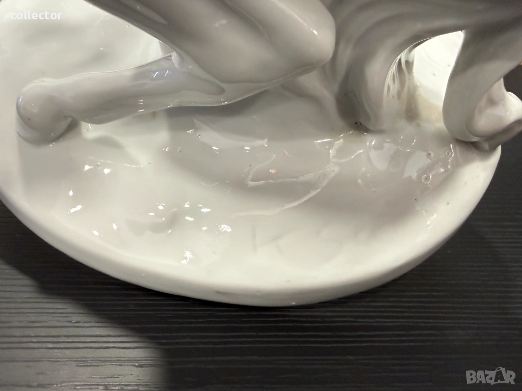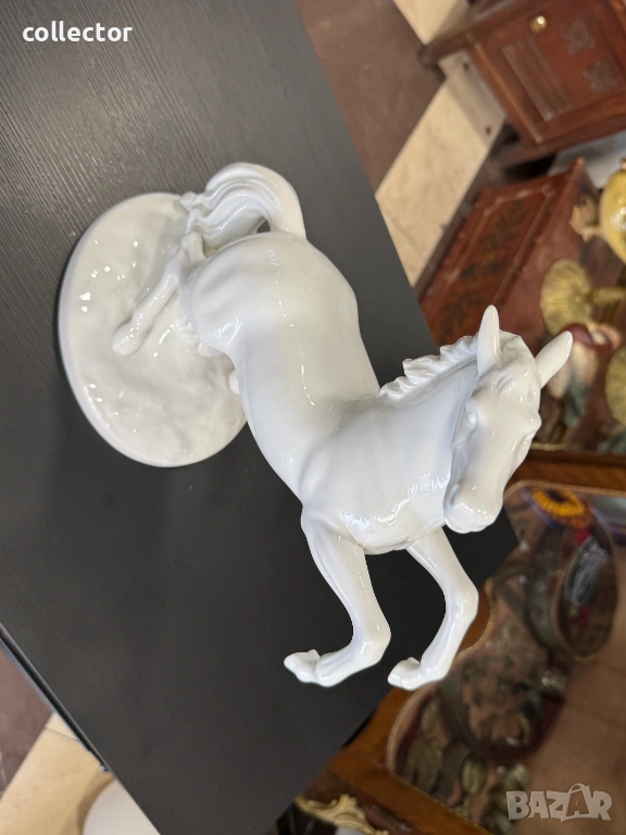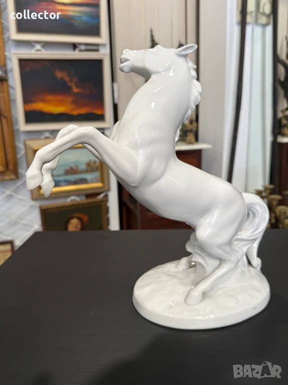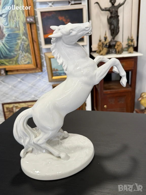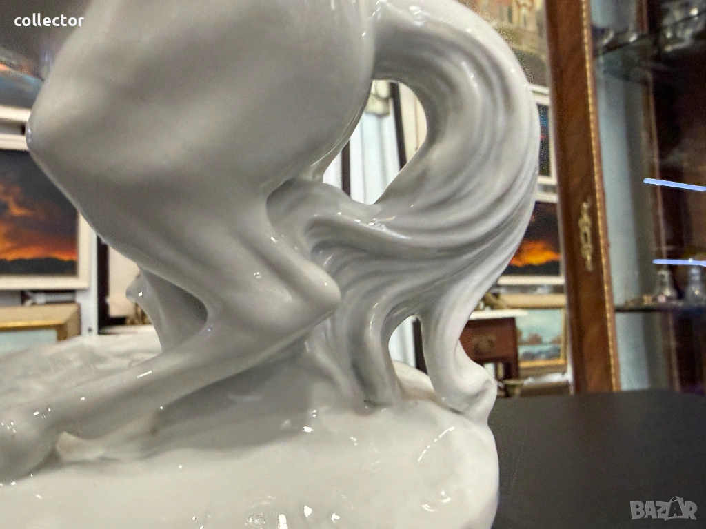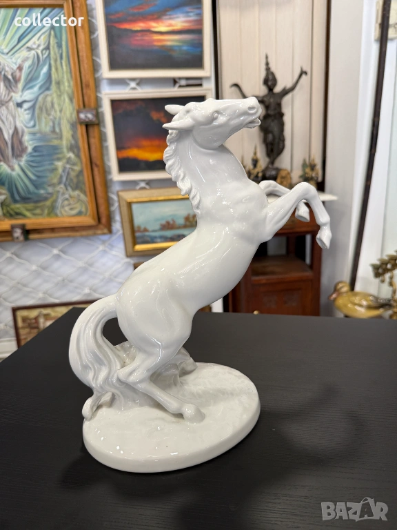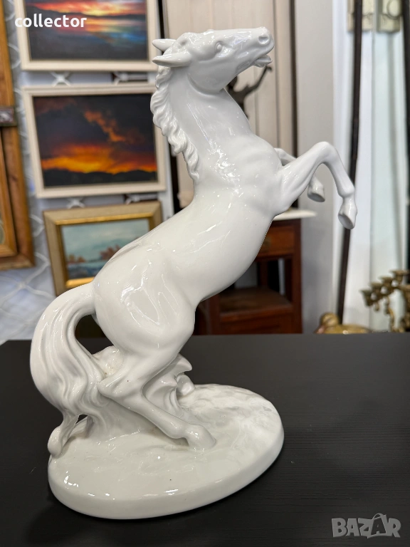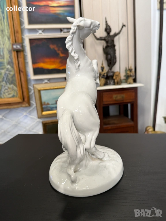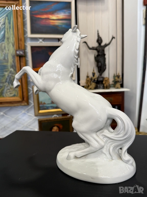 Величествен кон, изправен на задните си крака, с детайлно изработена грива и мускулатура. Изработена е от висококачествен бял глазиран порцелан, налични маркировки на фирма - Wallendorf.