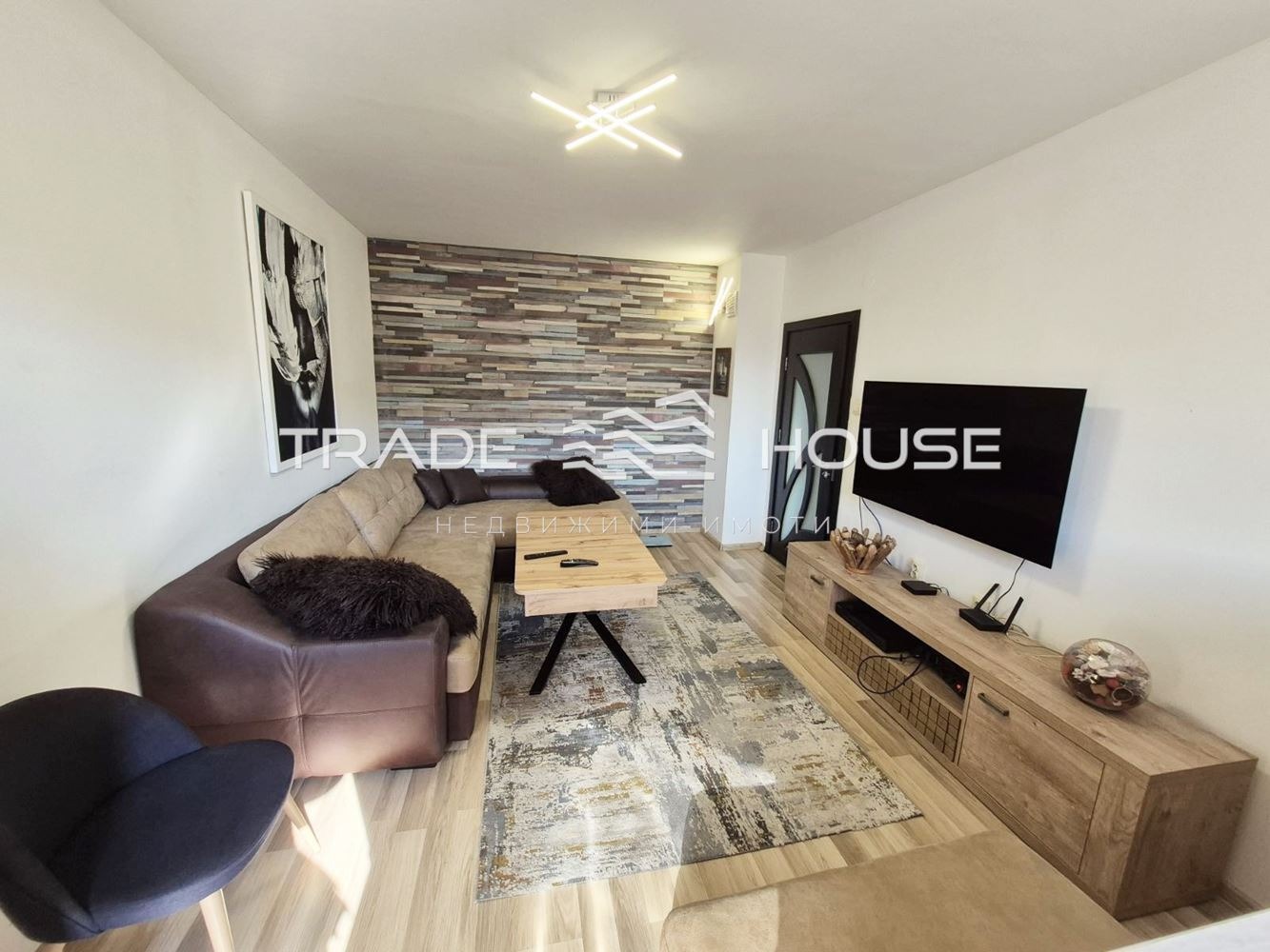 Имота е разположен на 3-ти етаж и се състои от хол с кухня( която е напълно оборудвана с уреди и кухненска посуда), две спални, баня с тоалетна, удобен коридор.