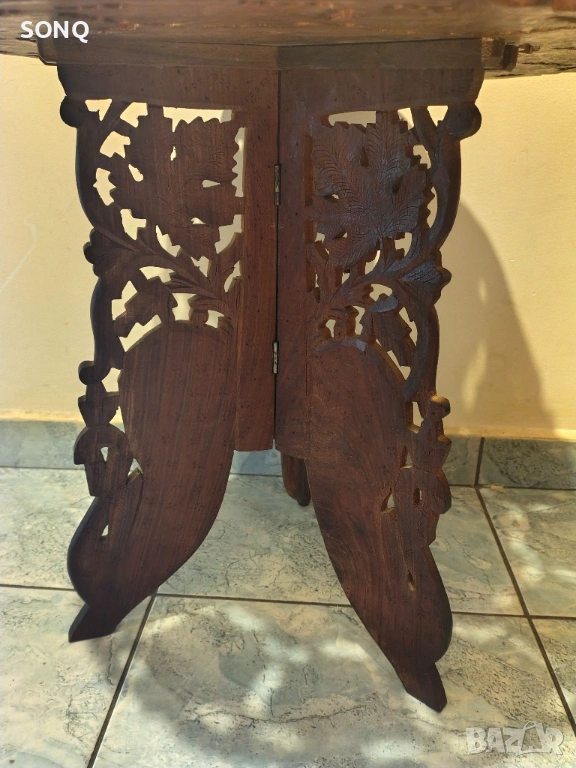 Много красива изработка със красива дърворезба и биволска костна орнаментика.Краката могат да се сгъват за по лесно пренасяне или прибиране. Само за ценители.