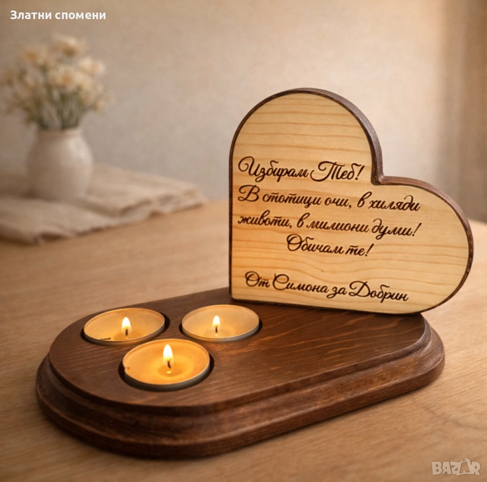 Този дизайнерски ръчно изработен свещник „Любов“ е създаден точно за такива моменти. Той съчетава естествената красота на дървото, топлината на светлината и силата на едно лично послание.