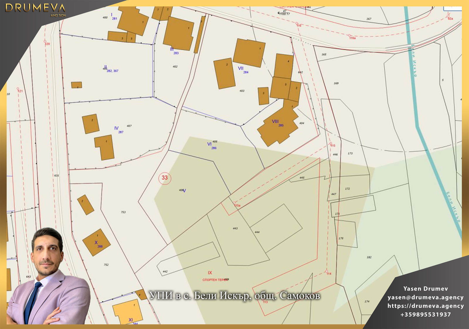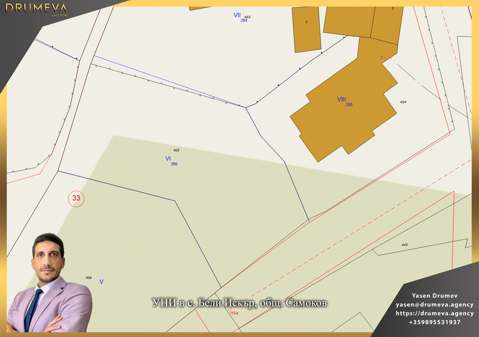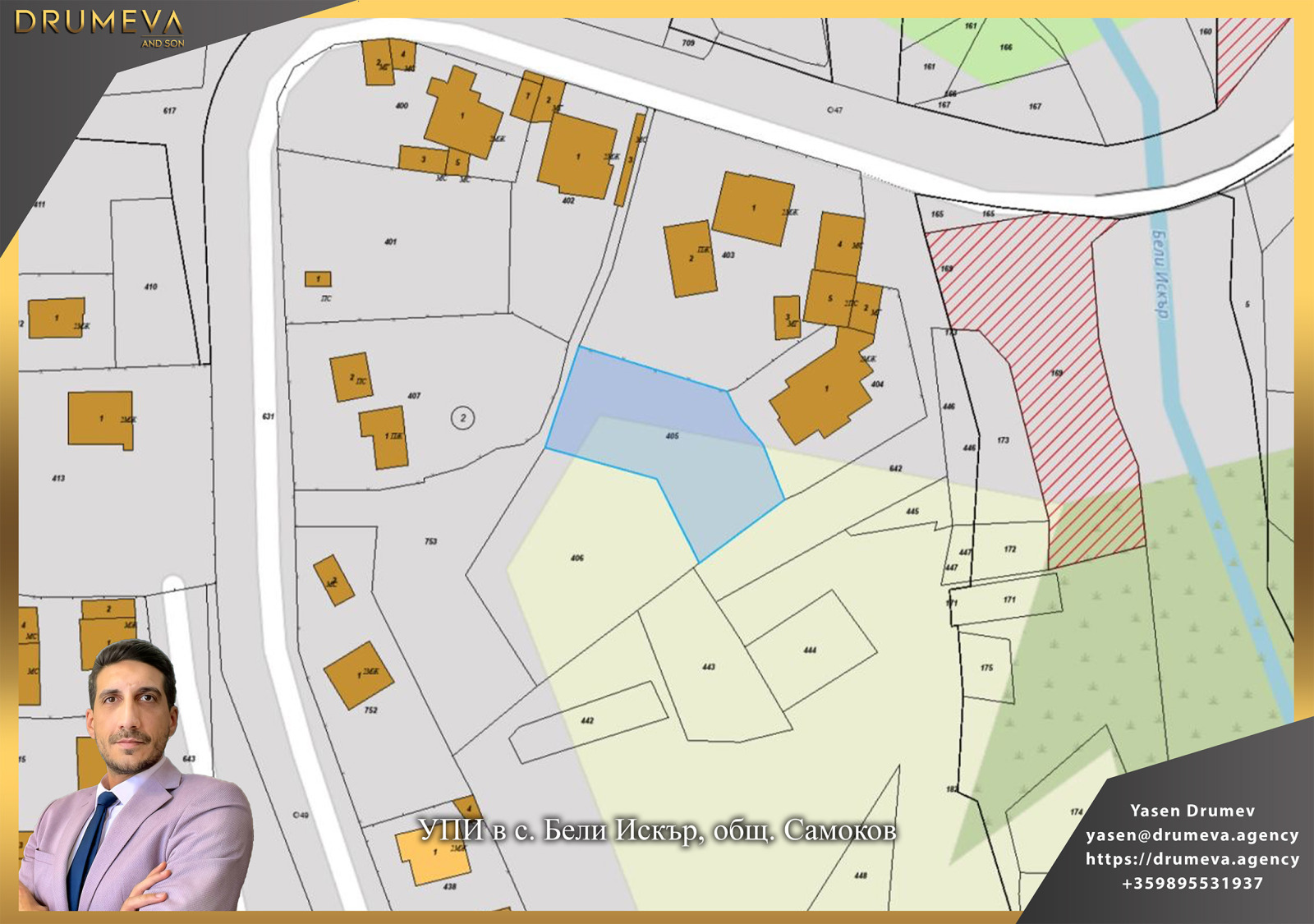 Имотът е с кадастрален идентификатор 03441.2.405, попада в урбанизирана територия и е с НТП незастроен имот за жилищни нужди. Парцелът е в регулация, с актуален устройствен статут, като е предвидено свободно застрояване и малкоетажно строителство до 3 етажа.