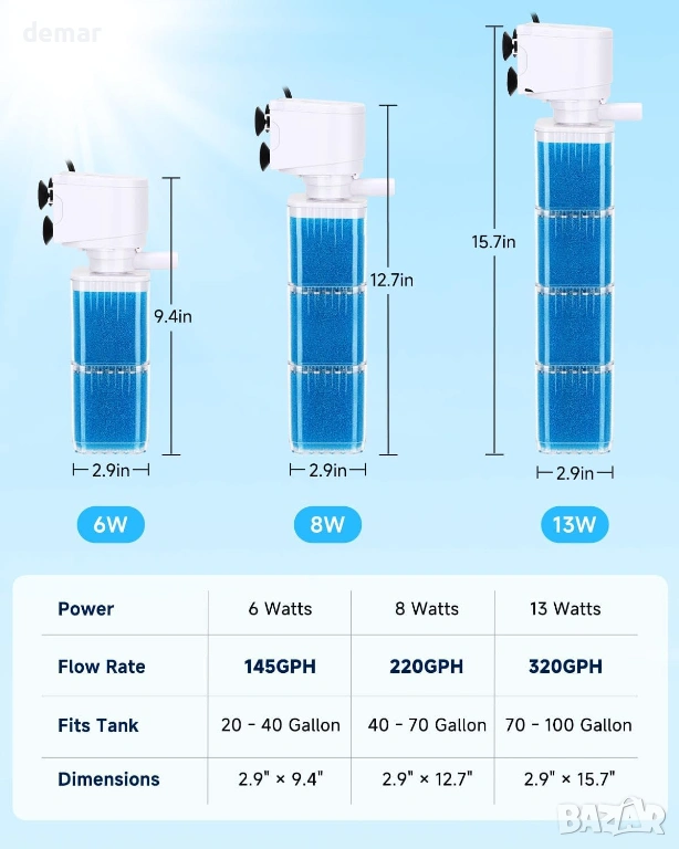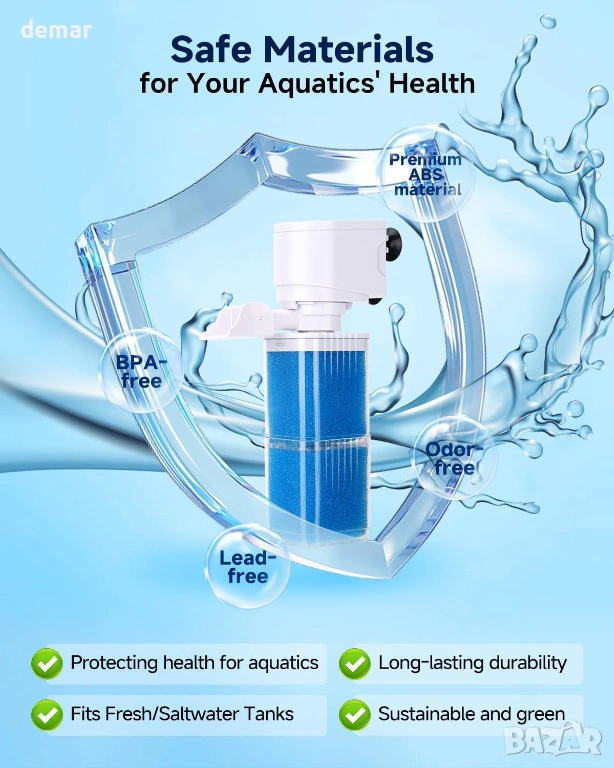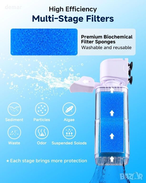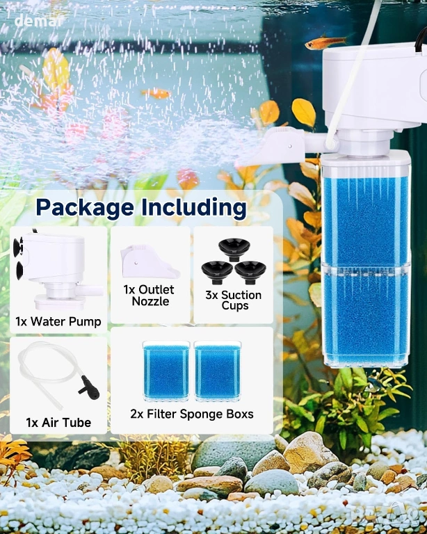Двуфункционален вътрешен филтър за аквариум, предлагащ както филтриране/циркулация на водата, така и опционално оксигениране с аерация с мехурчета, когато е свързан към въздушна тръба. Двуслойна гъбена филтрираща система улавя замърсявания и помага за поддържане на чиста вода, като същевременно намалява миризмите, подходящ за сладководни или соленоводни аквариуми и аквариуми за костенурки с обем около 75-150 литра. Уредът работи тихо благодарение на помпа за намаляване на шума и силиконови вендузи, които минимизират вибрациите, с режим на безшумна циркулация за по-спокойна работа или нежно бълбукане за допълнителна аерация. Прозрачният корпус позволява лесно визуално наблюдение на филтърния материал, така че нуждите от поддръжка са лесно забелязани, докато дизайнът с миеща се гъба намалява текущите разходи за подмяна и позволява персонализиране на филтриращия материал, ако е необходимо. Здравата, безопасна за аквариуми конструкция осигурява надеждна работа с лесно рутинно почистване за поддържане на ефективна работа.