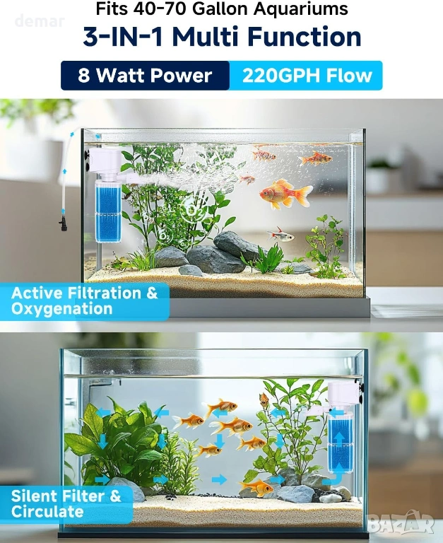 4-в-1 филтър за аквариум, многостепенна филтрация, регулируемо насищане с кислород/вълнообразуване