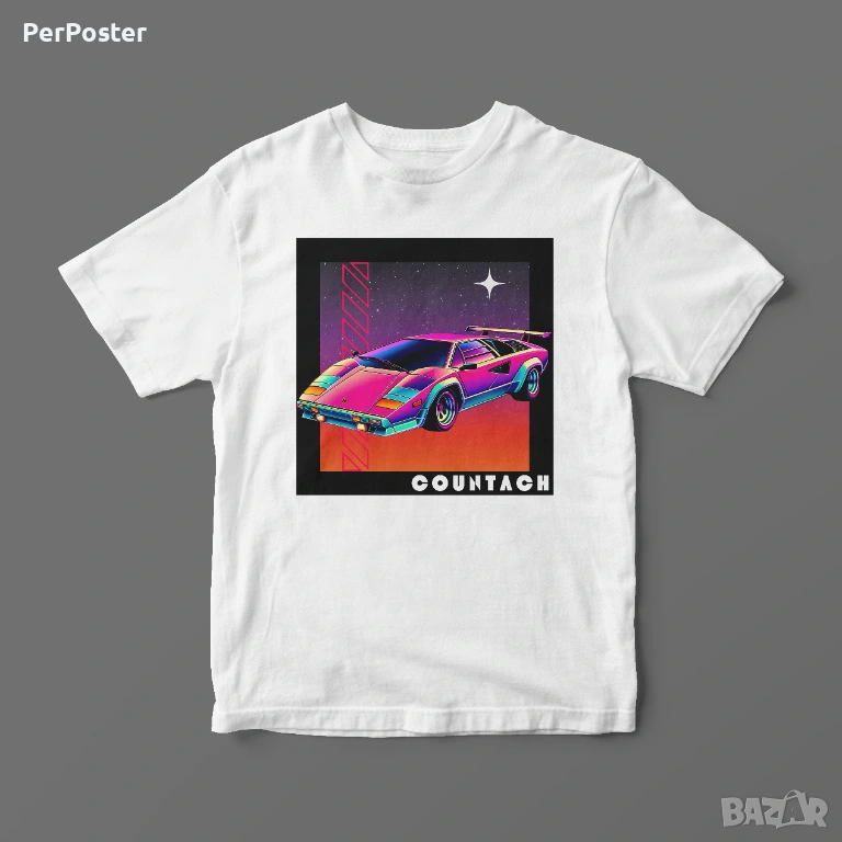 Тази бяла тениска е специално създадена за феновете на Lamborghini Countach. Изработена е от 100% памук, което осигурява отличен комфорт и удобство през целия ден. Тениската има стандартна кройка, подходяща за всекидневна употреба. Дизайнът включва ярко и атрактивно изображение на легендарния модел Lamborghini Countach на фона на космическа сцена. Надписът “Countach” е разположен в долната част на изображението, добавяйки завършеност на модерния и привлекателен дизайн. Тази тениска е част от колекцията Car Culture и е идеална за автомобилни ентусиасти.
