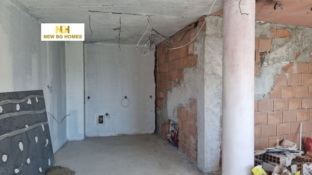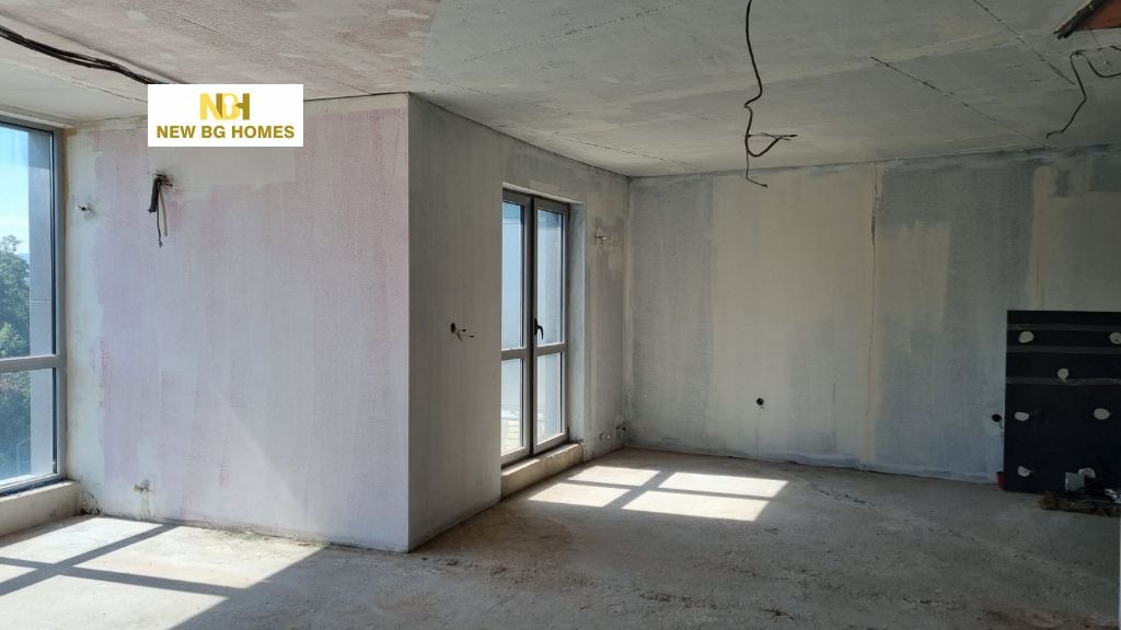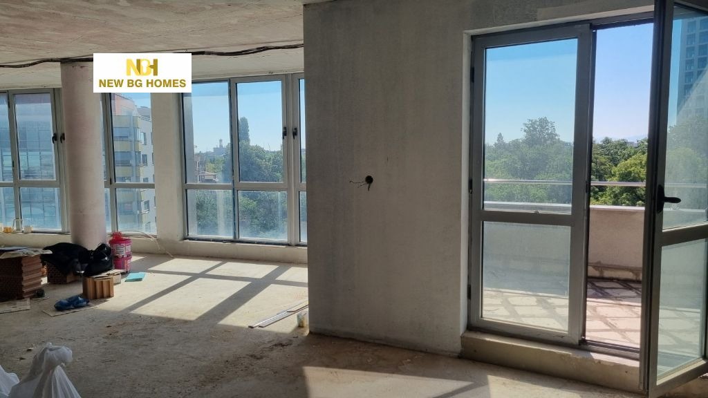 Ню БГ Хоумс предлага за продажба голям двустаен апартамент в тухлена сграда, масивно строителство, с перфектни общи части и с отлична локация в квартала - ул. 'Червена стена'. На метри от нея са Южен парк, хотел Маринела, спирки на градски транспорт, заведения за хранене, хранителни магазини и множество други удобства, предлагаща развитата инфраструктура на района. Сградата е с отстояние от булеварда, а жилището е просторно и светло с големи френски прозоци, с чиста площ от 129,27 кв.м. и се състои от обширна дневна в едно с кухня и столова, спалня, баня с тоалетна и тераса с прекрасна нескриваема гледка. В цената е влкючен интериорен проект, както и възможност за довършване на до БДС според желанието на купувача. Предлага се на шпакловка и замазка. Имотът разполага с мазе в сутерена на сградата с площ от 16,20кв.м. Паркирането е в зелена зона около сградата, като има възможност за ползване на гараж с дългосрочен наем.