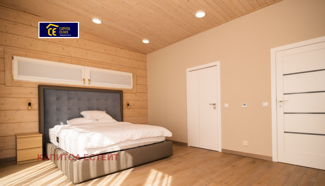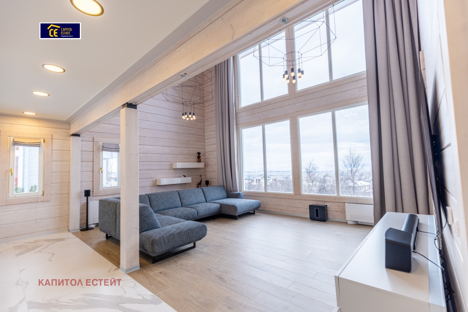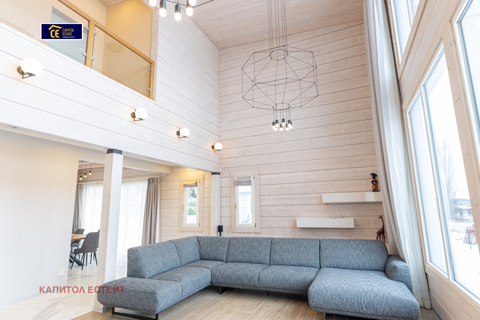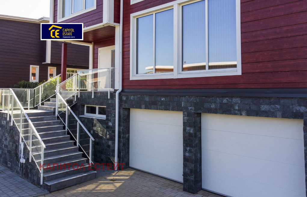 ПРЕДСТАВЯМЕ ВИ прекрасна еко - къща,построена изцяло от естествен дървен материал-финландски смърч,в изключително добре поддържан комплекс с 24- часова охрана,видеонаблюдение, озеленяване и поддържка, находящ се на уникално за София,място.Комплексът е съобразен изцяло с природосъобразния начин на живот,предлага на собствениците перфектен комфорт, чистота, тишишна и спокойствие.Намира се на пешеходно разстояние от гората и само на 10 минути с кола от центъра на столицата.Всяка къща в комплекса разполага със собствен ограден двор. Къщата се продава напълно обзаведена, като всичко е чисто ново и има следното разпределение: СУТЕРЕН, на кота -2,85,състоящ се от: стълбище, коридор, антре, фитнес, перално помещение, техническо помещение, сауна с душ кабина, тоалетна, два склада и гараж за два автомобила; ПЪРВИ ЕТАЖ, на кота +0,00 /нула/ метра,състоящ се от: входна площадка, антре, стълбище, баня с тоалетна, дневна, кухня с трапезария, гостна/кабинет и тераса/веранда; ВТОРИ ЕТАЖ, на кота +3,28 състоящ се от: стълбище, емпоре, три спални, едната от които с дрешник и самостоятелна баня с тоалетна, втора баня с тоалетна и балкон. Отоплението се извършва по най - икономичния и комфортен начин - посредством термопомпа с радиатори и подово отопление. Всичко в този дом е помислено и направено до най - малкия детайл, включително вградена прахосмукачка,вентилация, всички необходими инсталации, осветления и окабеляване. Извършени са всички необходими проверки, касаещи собствеността на имотите, върху които е построен комплекса и собствеността върху самата къща и дворното място и РАЗПОЛАГАМ С ЦЯЛАТА ДОКУМЕНТАЦИЯ, проверки за тежести и пълната история от преди започването на строителството!Ако имате каквито и да било въпроси относно този прекрасен имот или желаете да Ви организирам оглед се свържете с Цветомир Николов : 0879644547