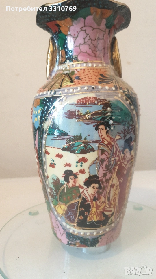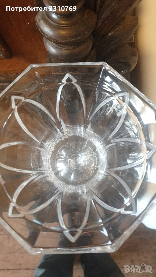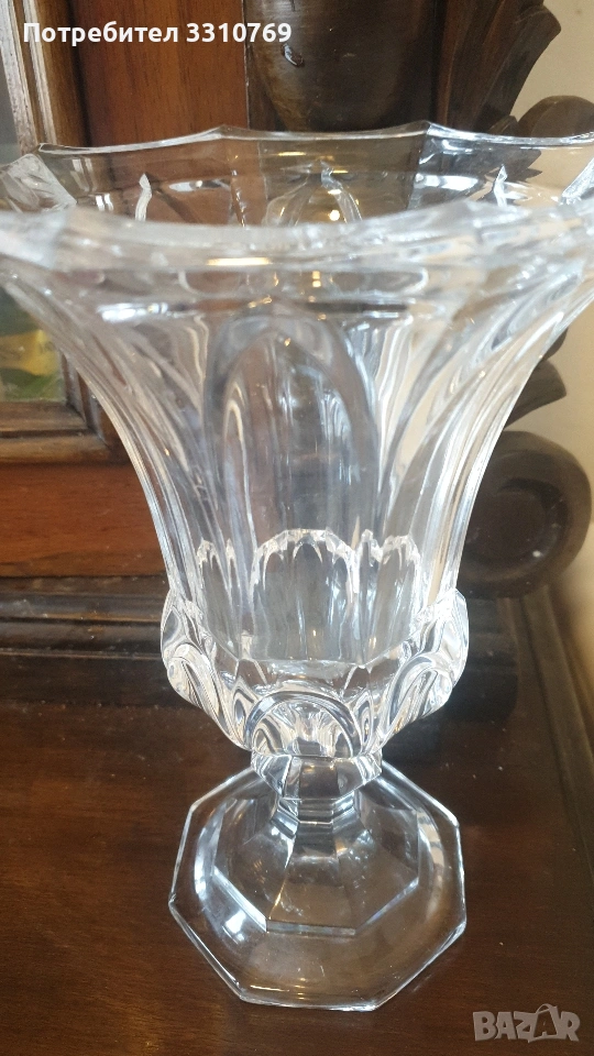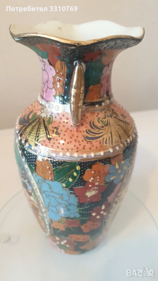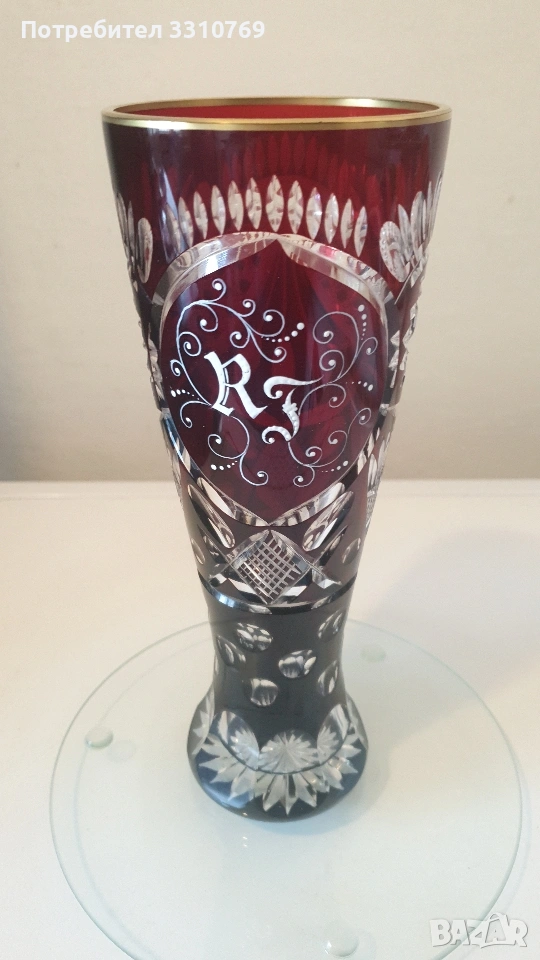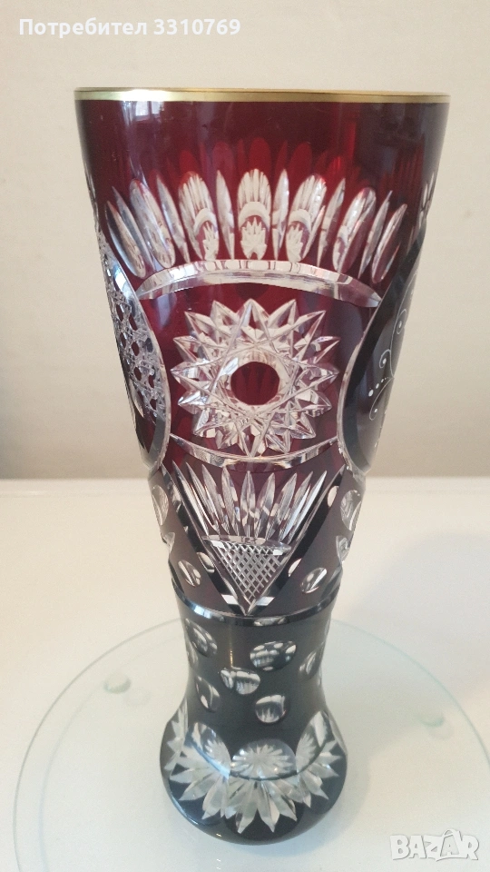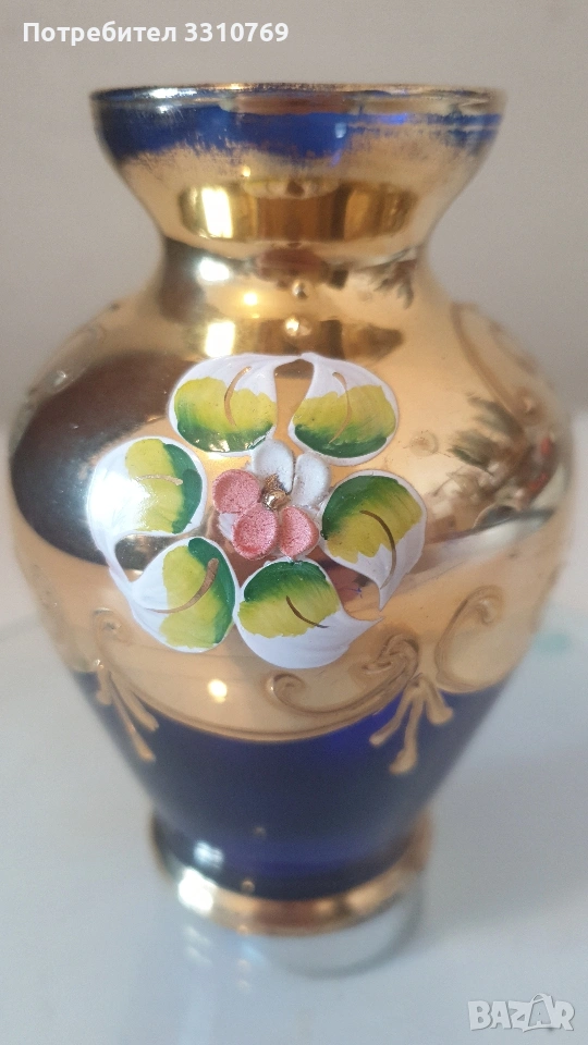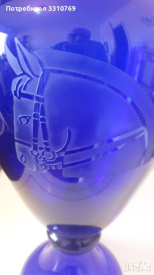 лена ваза в кобалтово син цвят,с черен прешлен между основата и елипсовидното тяло, с брилянтно гравирана конска глава със збруя, височина 54см., отвор 13см.,тегло 2280гр.!!!(Вероятно произведена на остров Мурано, Венеция. )цена =75€. Снимки от 5 до 7-много красива класическа кристална ваза на столче с височина 21см.,отвор 15см.,тегло1,100гр.!цена=25€. Снимки от 8 до 10- брилянтно гравирана кристална ваза с тъмно червен цвят и златен кант на горния ръб, височина 24см.,отвор 9см.( Бохемия, Чехия) цена 60€. Снимки от 11 до 13 красива класическа порцеланова китайска ваза, ръчно изработена и рисувана с много емайл и злато ,височина 20см.,отвор 9см.,цена 50€. Снимки от 14 до 16 - прекрасна стъклена ваза ръчно изработена и рисувана с емайл и злато , с височина 11,5см.,отвор 4,5см.,от остров Мурано ,Венеция. цена 15€.