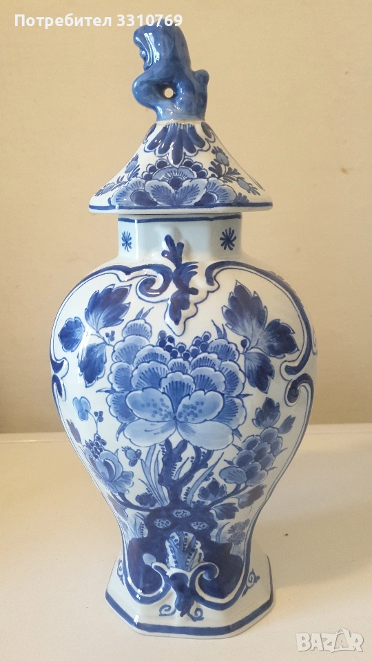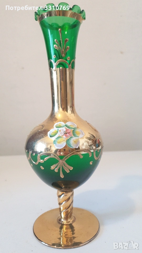 лена ваза в кобалтово син цвят,с черен прешлен между основата и елипсовидното тяло, с брилянтно гравирана конска глава със збруя, височина 54см., отвор 13см.,тегло 2280гр. ,отлично състояние!(Вероятно произведена на остров Мурано, Венеция. )цена =75€. Снимки от 5 до 7-много красива класическа кристална ваза на столче с височина 21см.,отвор 15см.,тегло1,100гр.!цена=25€. Снимки от 8 до 10- брилянтно гравирана кристална ваза с тъмно червен цвят и златен кант на горния ръб, височина 24см.,отвор 9см.( Бохемия, Чехия) цена 60€. Снимки от 11 до 13 красива класическа порцеланова китайска ваза, ръчно изработена и рисувана с много емайл и злато ,височина 20см.,отвор 9см.,цена 50€. Снимки от 14 до 16 - прекрасна стъклена ваза ръчно изработена и рисувана с емайл и злато , с височина 11,5см.,отвор 4,5см.,от остров Мурано ,Венеция. цена 15€. Снимки от 16 до 17- прекрасна порцеланова ваза Делфтс с капаче,височина 33см., отвор 6см.,цена 35€. Снимка 18- красива стъклена ваза ръчно изработена и рисувана с емайл и злато 24карата, височина 22см.,отвор 6см.,отлично състояние, цена 30€. За ценители на красотата на художествени изделия!