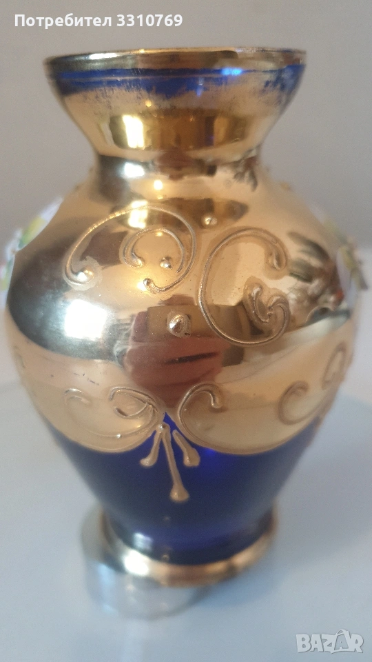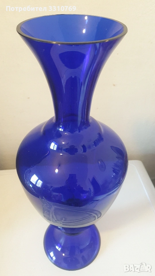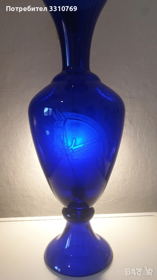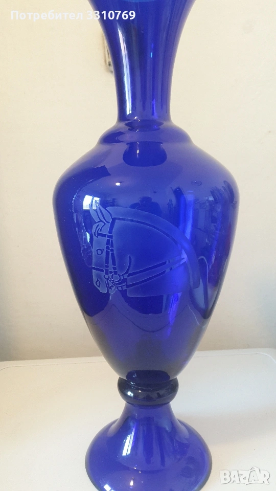 лена ваза в кобалтово син цвят,с черен прешлен между основата и елипсовидното тяло, с брилянтно гравирана конска глава със збруя, височина 54см., отвор 13см.,тегло 2280гр.!!!(Вероятно произведена на остров Мурано, Венеция. )цена =75€. Снимки от 5 до 7-много красива класическа кристална ваза на столче с височина 21см.,отвор 15см.,тегло1,100гр.!цена=25€. Снимки от 8 до 10- брилянтно гравирана кристална ваза с тъмно червен цвят и златен кант на горния ръб, височина 24см.,отвор 9см.( Бохемия, Чехия) цена 60€. Снимки от 11 до 13 красива класическа порцеланова китайска ваза, ръчно изработена и рисувана с много емайл и злато ,височина 20см.,отвор 9см.,цена 50€. Снимки от 14 до 16 - прекрасна стъклена ваза ръчно изработена и рисувана с емайл и злато , с височина 11,5см.,отвор 4,5см.,от остров Мурано ,Венеция. цена 15€.