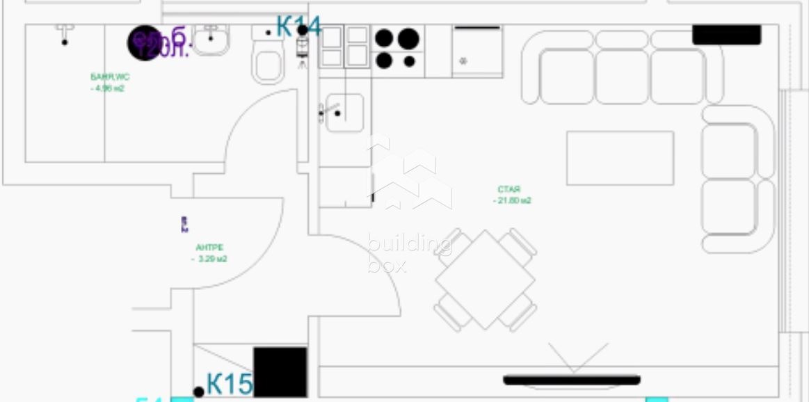 - РАЗПРЕДЕЛЕНИЕ: Всекидневна с кухненски бокс с площ от 21,80 кв.м., антре, баня с тоалетна и тераса*.