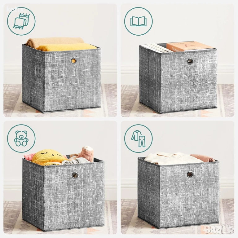 Организирайте вещите си с тези кутии за съхранение,издръжливи и стабилни кутия за съхранение. Всяка кутия може да побере до 5 кг с твърда конструкция, изработена от нетъкан текстил с плътност 80 г/м² и картон с дебелина 1,9 мм.