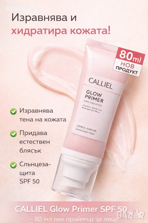 Предлагаме CALLIEL Glow Primer SPF 50 – лек праймър за лице, който подпомага изравняването на тена и придава естествен блясък на кожата. Подходящ е както за ежедневна употреба, така и като основа преди грим.