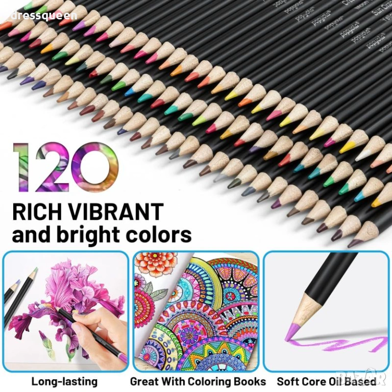 Идеалният комплект моливи за оцветяване за пътуване или работа на открито. Този голям комплект от 120 цвята е прибран в издръжлив текстилен калъф с цип, който замества нуждата от допълнителен пенал. Всеки от 120-те уникални цвята има свое индивидуално ластично място, осигуряващо отлична организация и защита от счупване. Моливите са с черен дървен корпус и са лесни за идентифициране благодарение на цветния код и имената. Меката сърцевина от 3.8мм гарантира гладко нанасяне. В допълнение, получавате острилка и ръководство, за да започнете веднага.