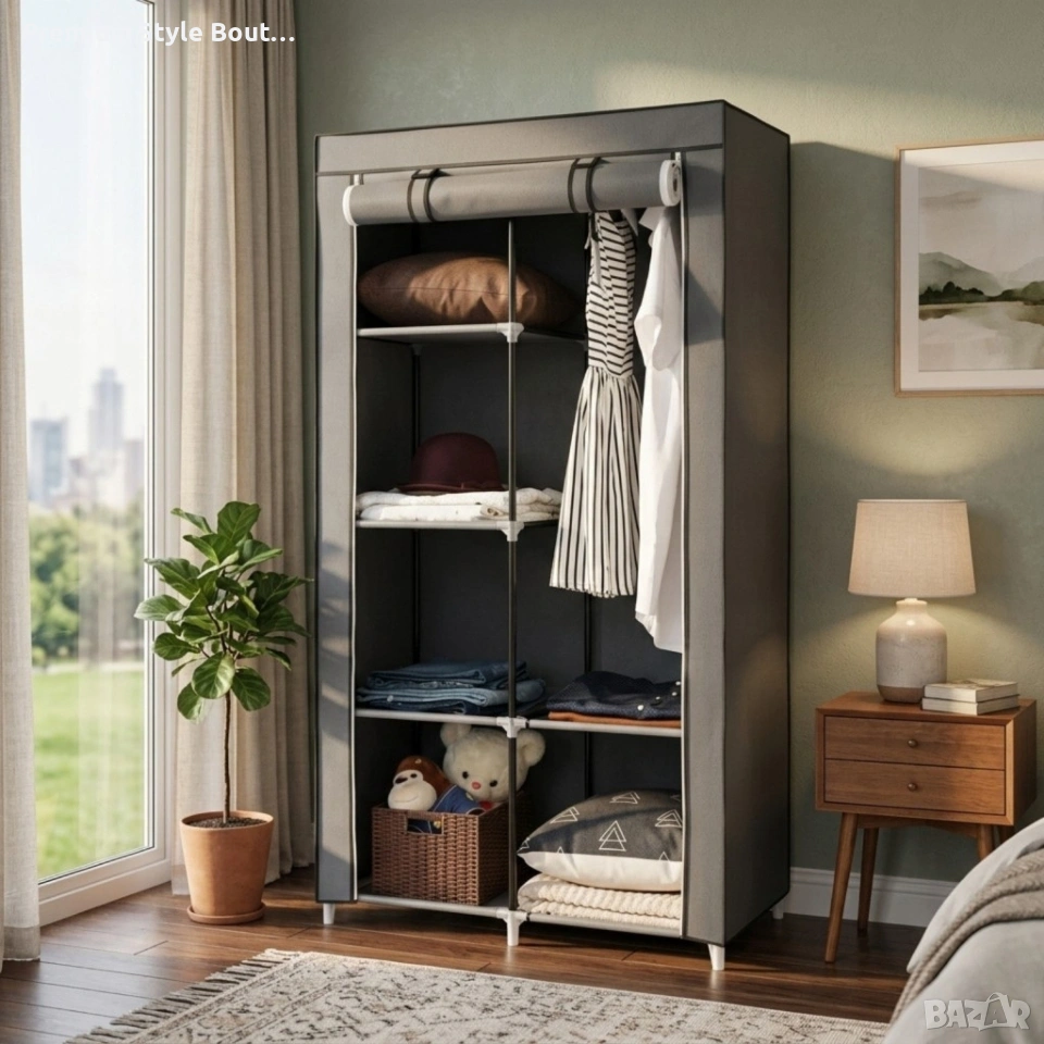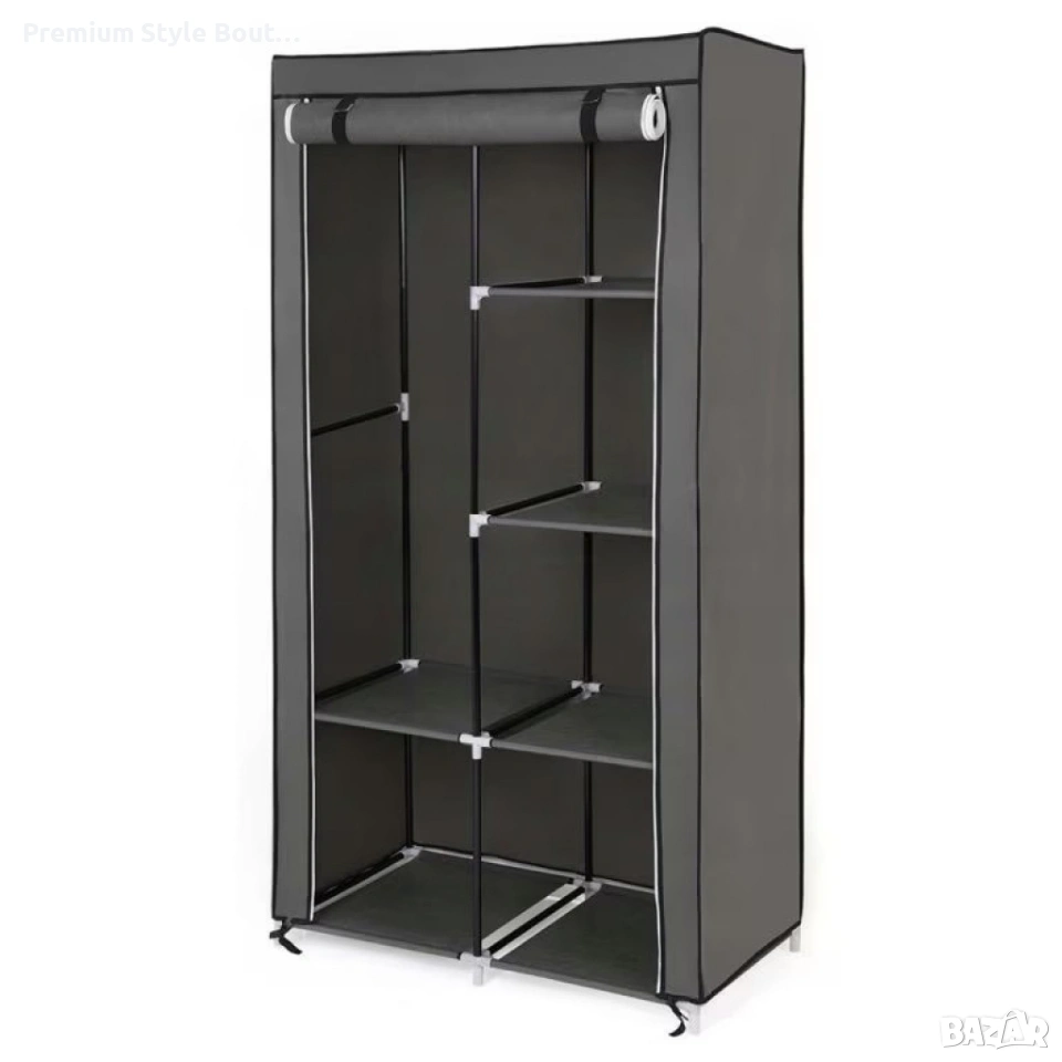 Размери: 87 x 43 x 166 см Материал: пластмаса, PE (полиетилен) покритие Цвят: сив Брой конектори: 28 бр. Комплект тръби: включени за монтаж Тип отваряне: ролкова платнена врата с цип Подходящ за: спалня, коридор, общежитие, временни решения при преместване