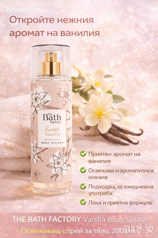 Предлагаме The Bath Factory Vanilla Body Splash – лек и освежаващ спрей за тяло с приятен и топъл аромат на ванилия. Подходящ за ежедневна употреба, когато искате да се чувствате свежи и ароматни през целия ден.
