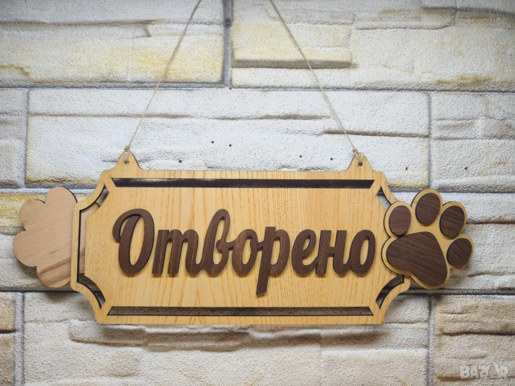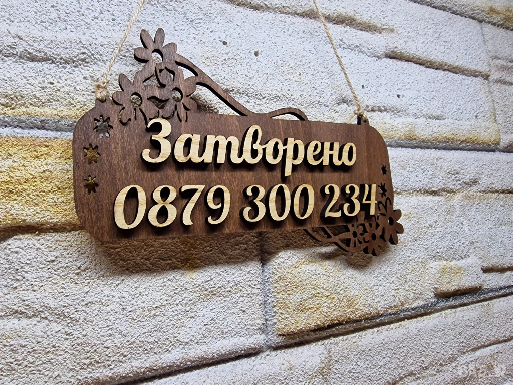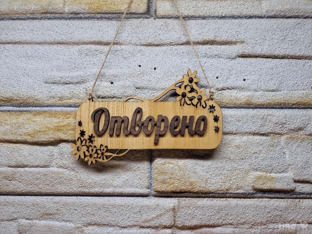 Дървена декоративна табела с надпис "Отворено" на български език. Табелата е изработена от дърво и има украса от цветя. Подходяща за окачване на вратата на магазин или друго заведение, за да покаже дали е отворено или затворено.