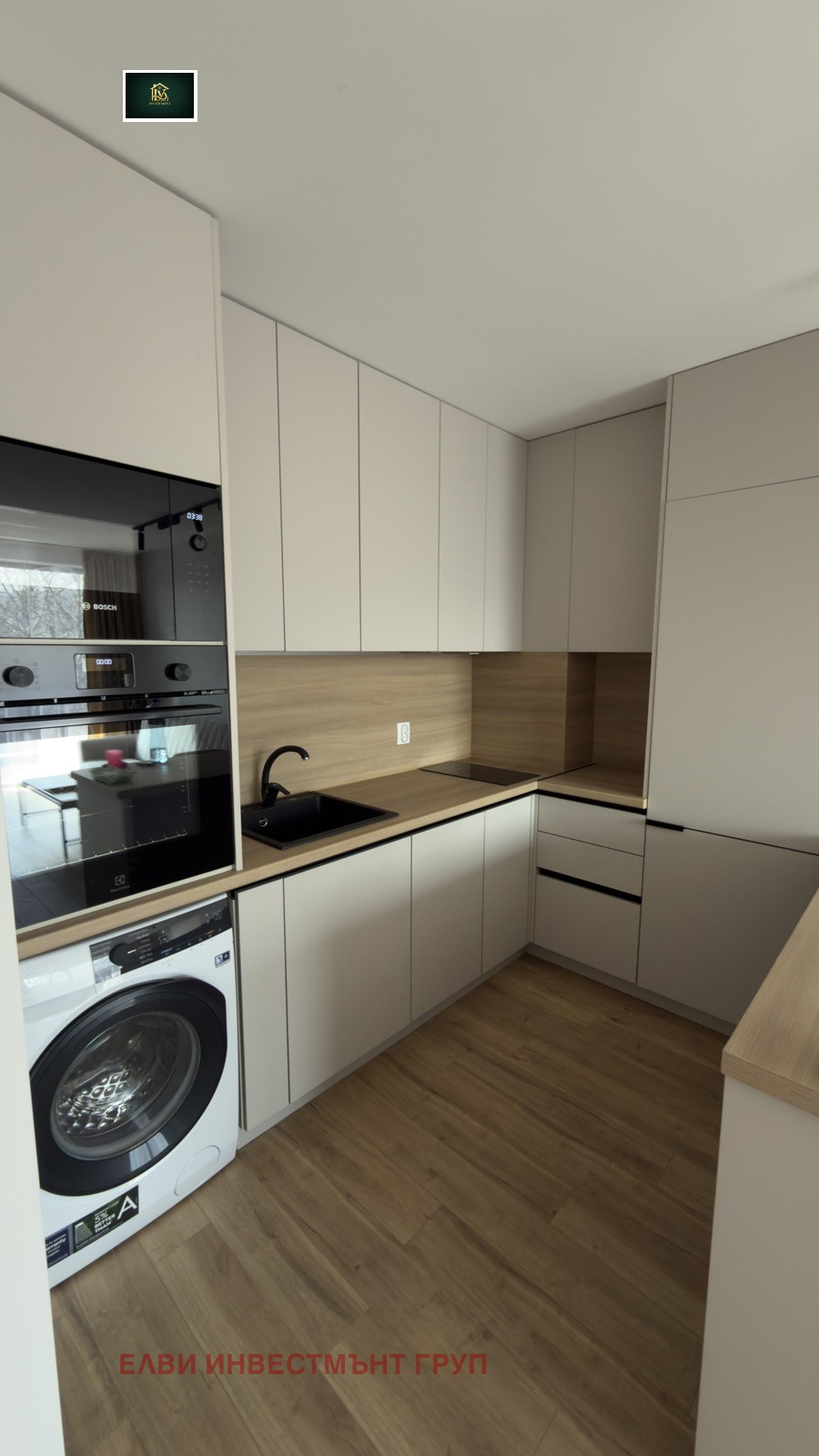 -дневна с кухненски бокс, оборудват с висок клас електроуреди (фурна, котлони, микровълнова фурна, хладилник, съдомиялна и пералня)