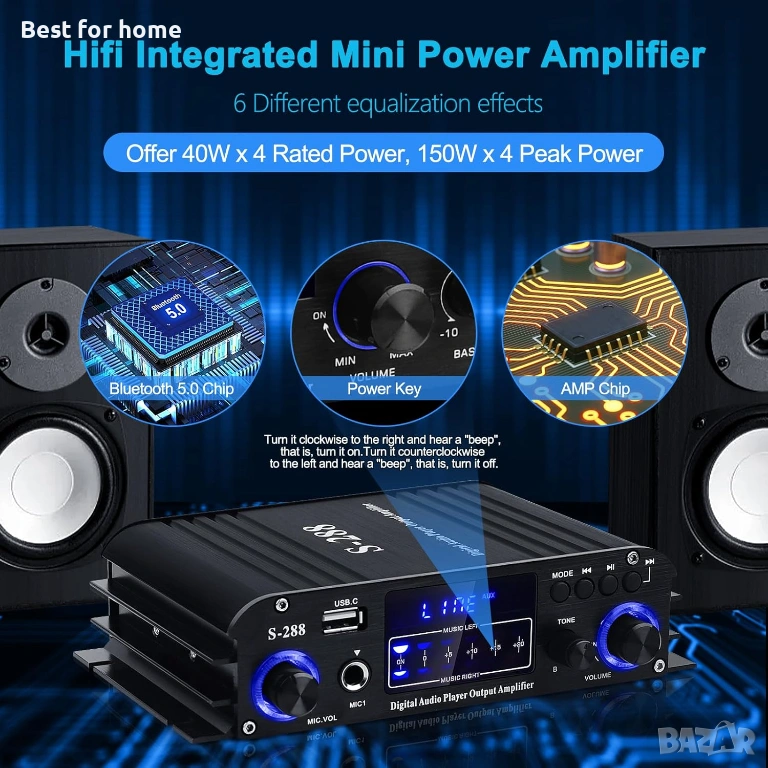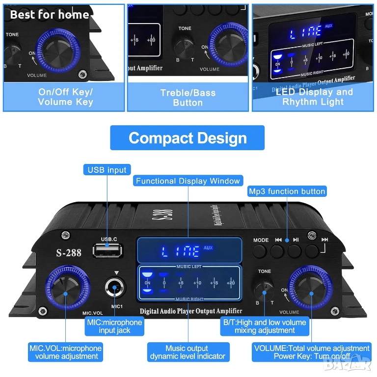 HiFi усилвател: Този S-288 е Bluetooth HiFi аудио усилвател с мощен чип за обработка на аудио, декодирането без загуби и минималното изкривяване осигуряват чисто качество на звука, процент на изкривяване ≤0,5%, силна способност против смущения, екранираща индуктивност. Контролите на високите и басовите честоти ви позволяват фино да настройвате звука, независимо дали искате дълбок бас или ясни високи честоти, този усилвател ще изпълни вашите желания. Нека S288 стане вашият най-добър спътник във вашето музикално пътешествие и да изследва тайните на музиката.
