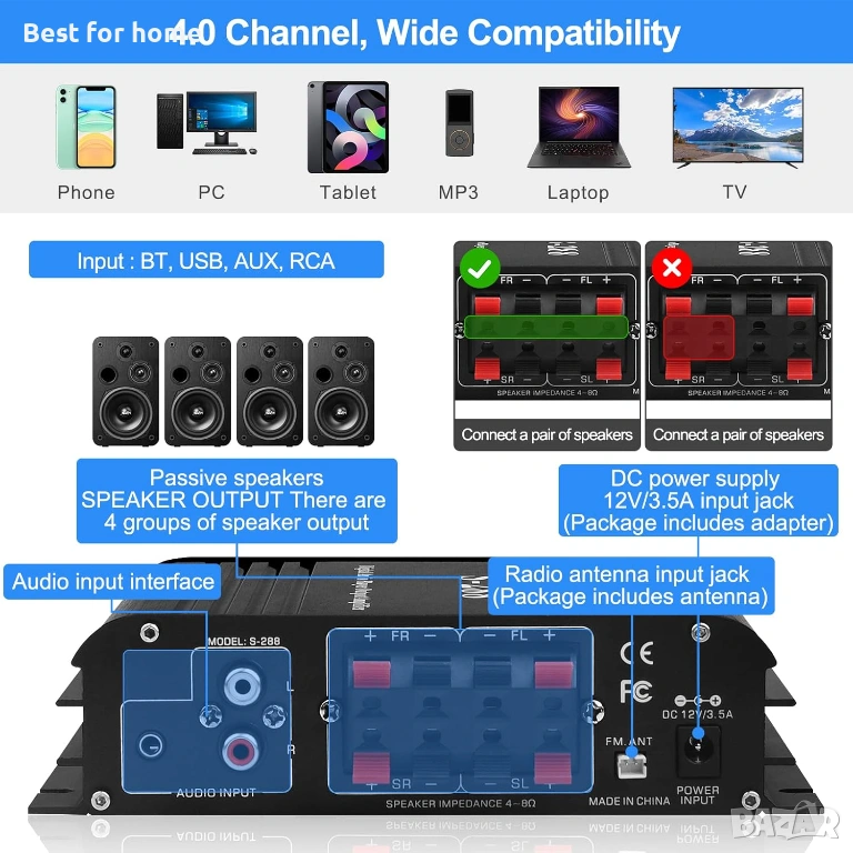 Bluetooth вход и многофункционалност: Този домашен аудио усилвател с Bluetooth, RCA, AUX, USB/SD вход и вграден Bluetooth 5.0 чип позволява бързо свързване с аудио входни устройства като смартфони, MP3, таблети, телевизори и др. Безжичната Bluetooth 5.0 връзка спестява затруднения с окабеляването и осигурява отлична качествен звук, чудесна за домашно кино и автомобилни високоговорители. (Забележка: Bluetooth връзката е в рамките на 5 м/16,4 фута). RCA вход, аудио от външни устройства, като телевизор, компютър, компютри, таблети, лаптопи.