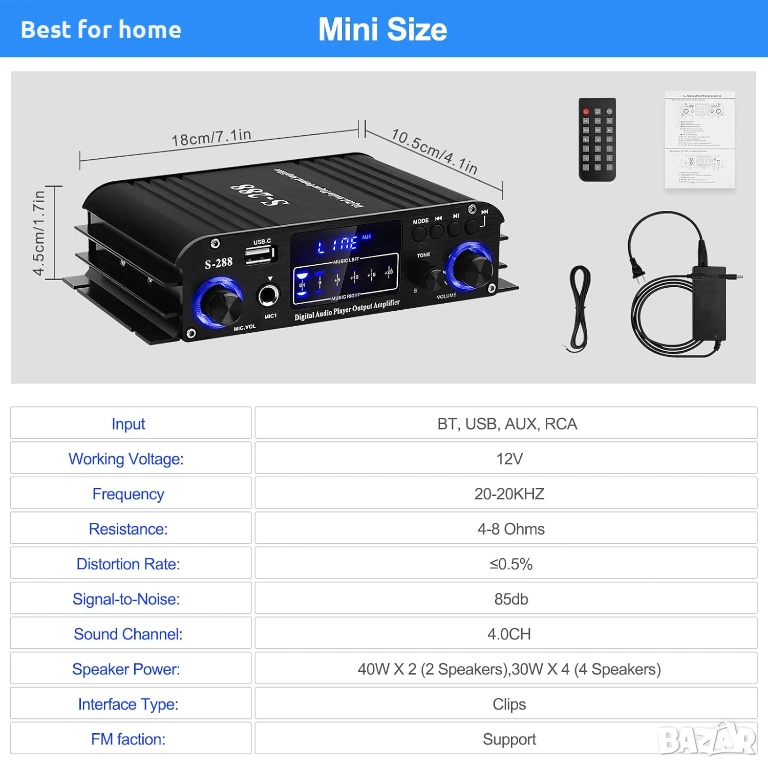 Мини размер: Размерът на S-288 hifi bluetooth аудио усилвател е 7.1 x 4.1 x 1.7 инча, мини размерът е лесен за носене, като домашен аудио усилвател, не заема много място, чудесен за употреба на открито и закрито.